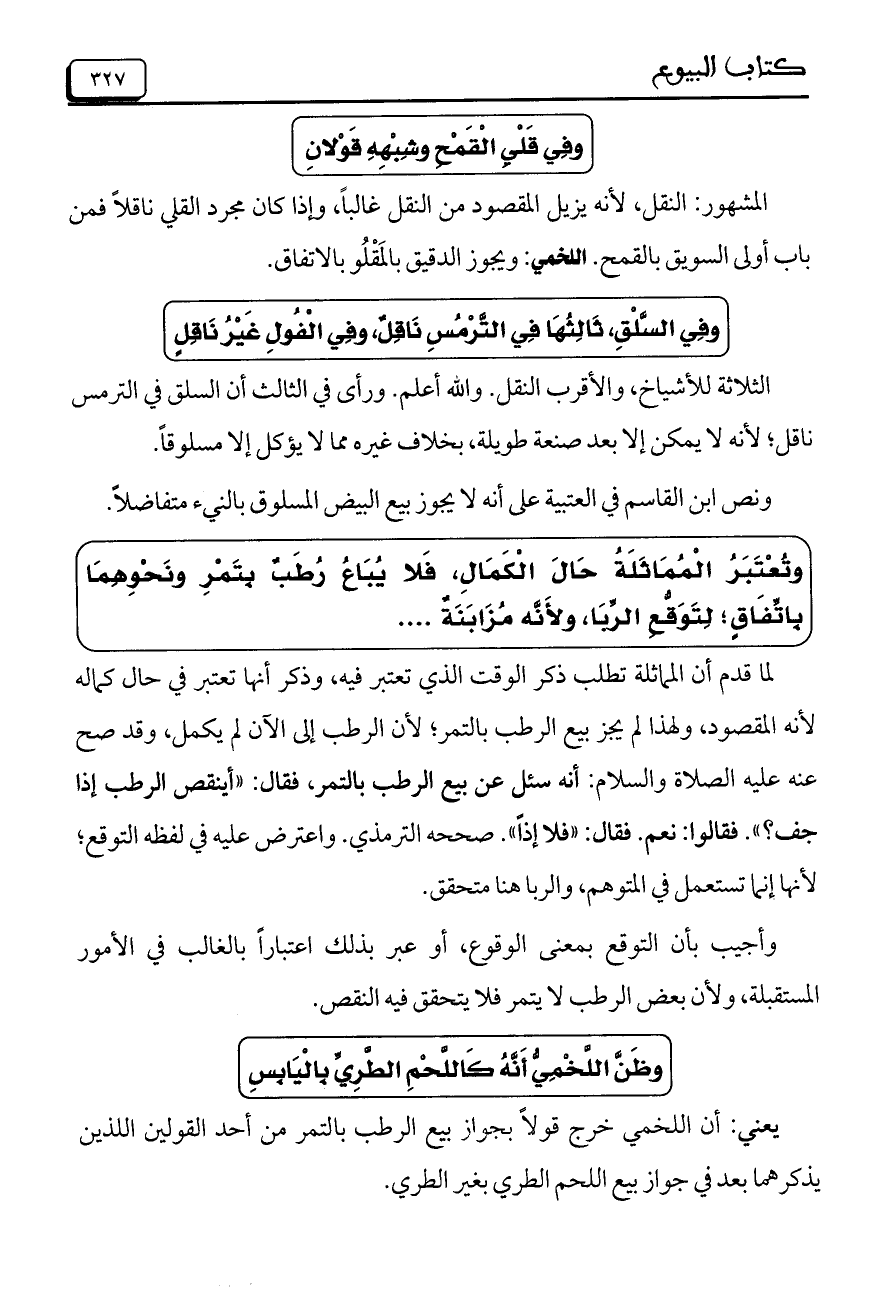 لما قدم أن المماثلة تطلب ذكر الوقت الذي تعتبر فيه، وذكر أنها تعتبر في حال كماله لأنه المقصود، ولهذا لم يجز بيع الرطب بالتمر، لأن الرطب إلى الآن لم يكمل، وقد صح عنه عليه الصلاة والسلام: أنه سئل عن بيع الرطب بالتمر، فقال: ((أينقص الرطب إذا جف؟)). فقالوا: نعم. فقال: ((فلا إذاً)). صححه الترمذي. واعترض عليه في لفظه التوقع، لأنها إنما تستعمل في المتوهم، والربا هنا متحقق.