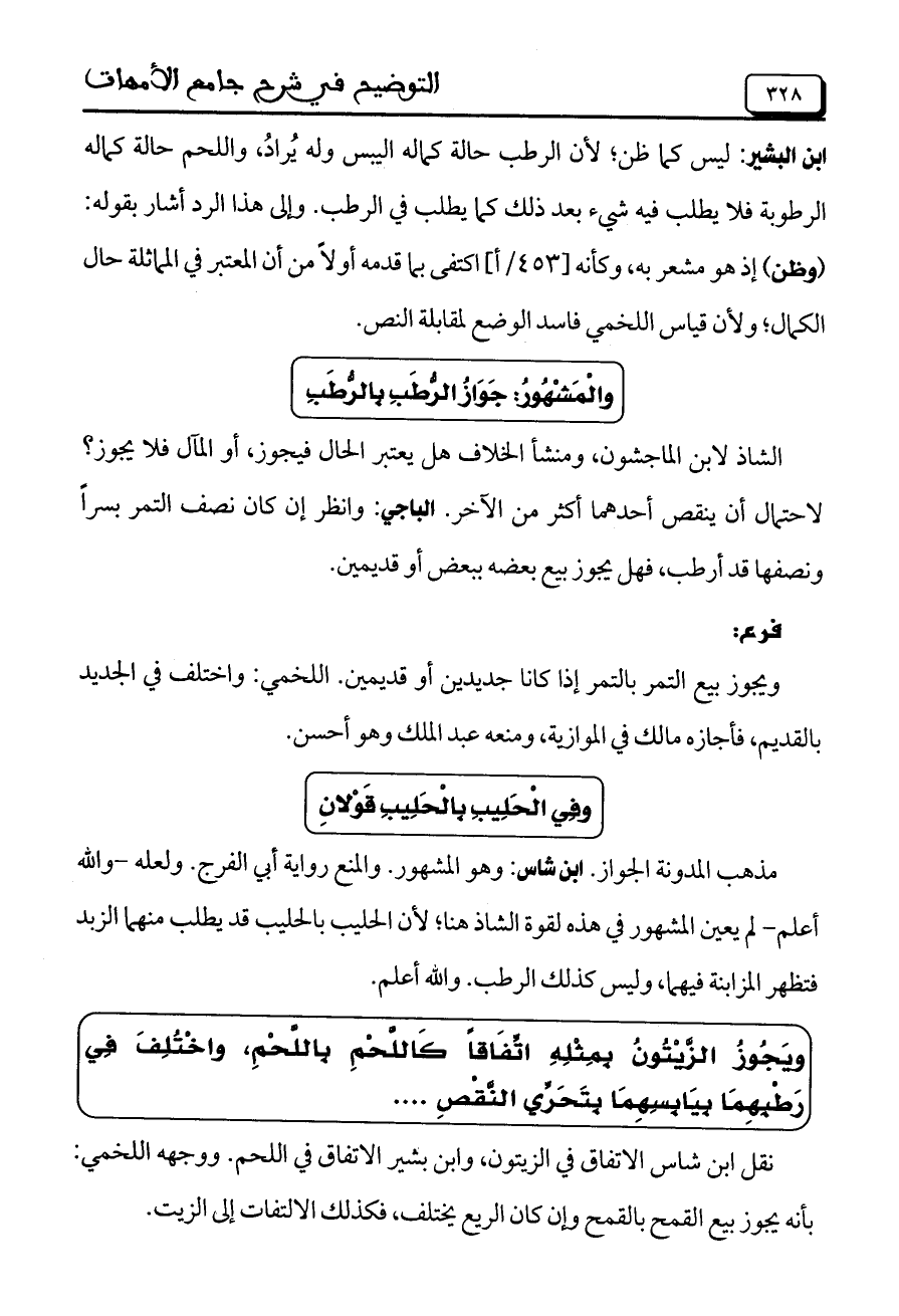ابن البشير: ليس كما ظن، لأن الرطب حالة كماله اليبس وله يُرادُ، واللحم حالة كماله الرطوبة فلا يطلب فيه شيء بعد ذلك كما يطلب في الرطب. وإلى هذا الرد أشار بقوله: (وظن) إذ هو مشعر به، وكأنه [453/أ] اكتفى بما قدمه أولاً من أن المعتبر في المماثلة حال الكمال، ولأن قياس اللخمي فاسد الوضع لمقابلة النص.