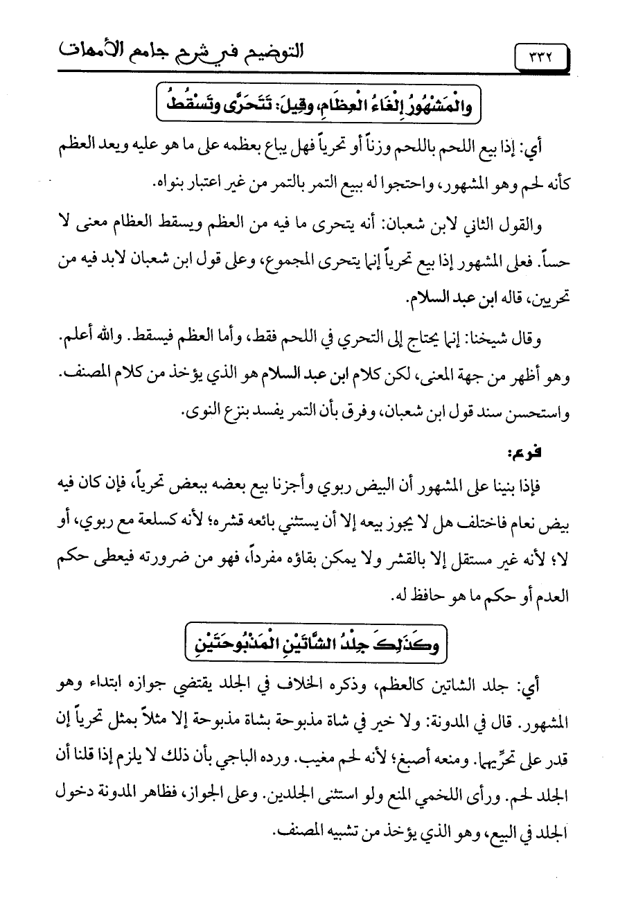 والقول الثاني لابن شعبان: أنه يتحرى ما فيه من العظم ويسقط العظام معنى لا حساً. فعلى المشهور إذا بيع تحرياً إنما يتحرى المجموع، وعلى قول ابن شعبان لابد فيه من تحريين، قاله ابن عبد السلام.