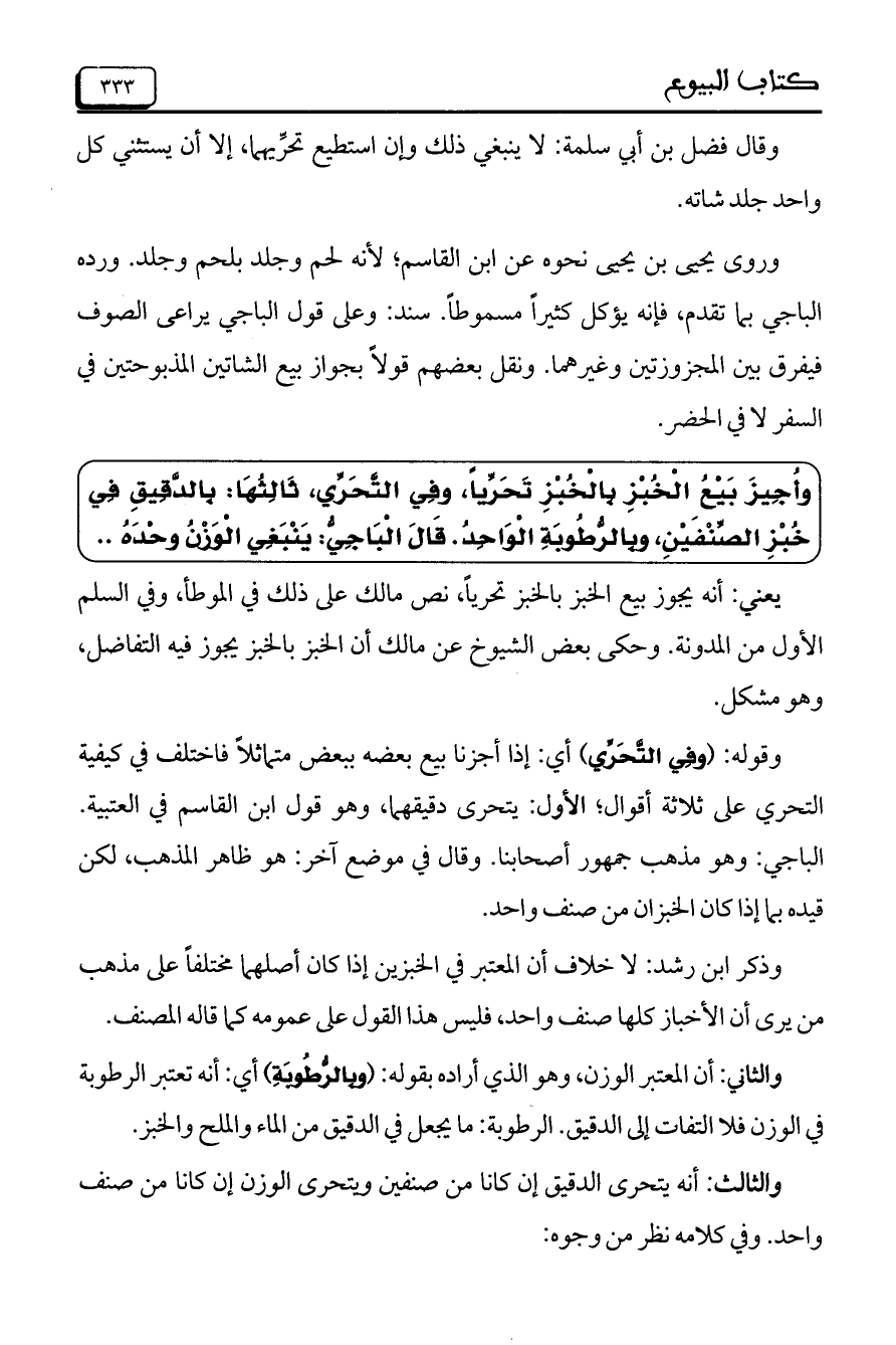 يعني: أنه يجوز بيع الخبز بالخبز تحرياً، نص مالك على ذلك في الموطأ، وفي السلم الأول من المدونة. وحكى بعض الشيوخ عن مالك أن الخبز بالخبز يجوز فيه التفاضل، وهو مشكل.