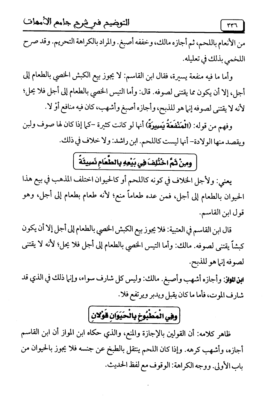 ظاهر كلامه: أن القولين بالإجازة والمنع، والذي حكاه ابن المواز أن ابن القاسم أجازه، وأشهب كرهه. وإذا كان اللحم ينتقل بالطبخ عن جنسه فلا يجوز بالحيوان من باب الأولى. ووجه الكراهة: الوقوف مع لفظ الحديث.