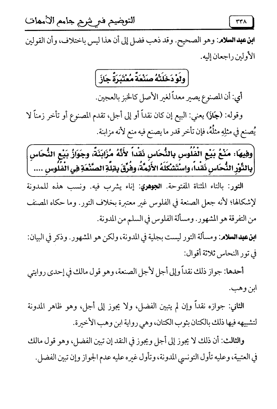 وفيها: منع بيع الفلوس بالنحاس نقداً لأنه مزابنة، وجواز بيع النحاس بالتور النحاس نقداً، واستشكله الأئمة، وفرق بقلة الصنعة في الفلوس ....