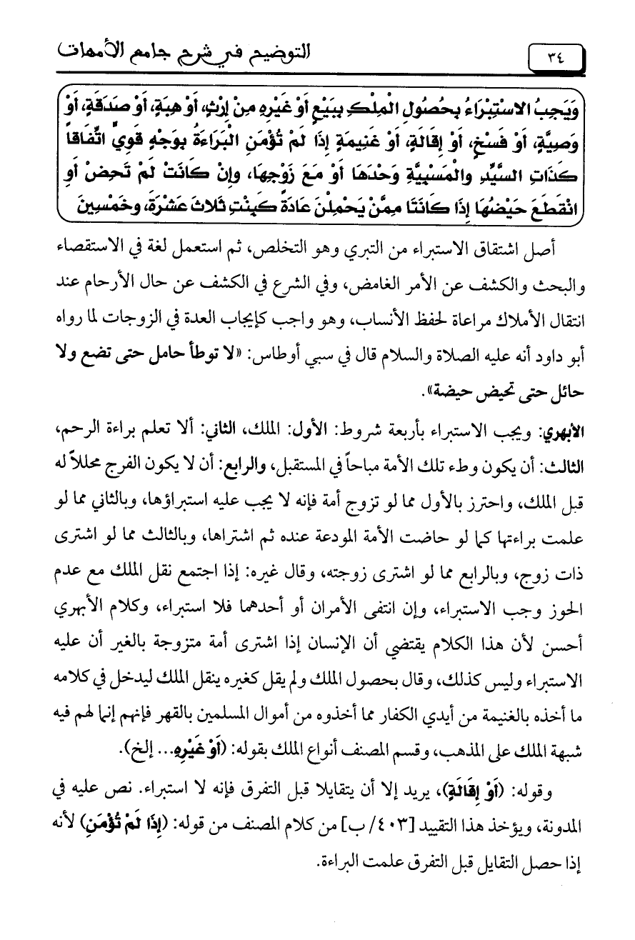 الأبهري: ويجب الاستبراء بأربعة شروط: الأول: الملك، الثاني: ألا تعلم براءة الرحم، الثالث: أن يكون وطء تلك الأمة مباحاً في المستقبل، والرابع: أن لا يكون الفرج محللاً له قبل الملك، واحترز بالأول مما لو تزوج أمة فإنه لا يجب عليه استبراؤها، وبالثاني مما لو علمت براءتها كما لو حاضت الأمة المودعة عنده ثم اشتراها، وبالثالث مما لو اشترى ذات زوج، وبالرابع مما لو اشترى زوجته، وقال غيره: إذا اجتمع نقل الملك مع عدم الحوز وجب الاستبراء، وإن انتفى الأمران أو أحدهما فلا استبراء، وكلام الأبهري أحسن لأن هذا الكلام يقتضي أن الإنسان إذا اشترى أمة متزوجة بالغير أن عليه الاستبراء وليس كذلك، وقال بحصول الملك ولم يقل كغيره ينقل الملك ليدخل في كلامه ما أخذه بالغنيمة من أيدي الكفار مما أخذوه من أموال المسلمين بالقهر فإنهم إنما لهم فيه شبهة الملك على المذهب، وقسم المصنف أنواع الملك بقوله: (أَوْ غَيْرِهِ ... إلخ).
