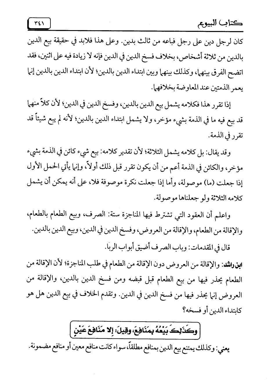 ابن راشد: والإقالة من العروض دون الإقالة من الطعام في طلب المناجزة، لأن الإقالة من الطعام يحذر فيها من بيع الطعام قبل قبضه ومن فسخ الدين بالدين، والإقالة من العروض إنما يحذر فيها من فسخ الدين في الدين. وتقدم الخلاف في بيع الدين هل هو كابتداء الدين أو فسخه؟