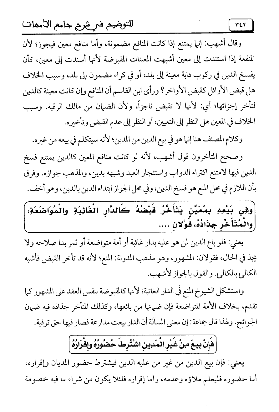 وقال أشهب: إنما يمتنع إذا كانت المنافع مضمونة، وأما منافع معين فيجوز، لأن المنفعة إذا استندت إلى معين أشبهت المعينات المقبوضة لأنه أسندت إلى معين، كأن يفسخ الدين في ركوب دابة معينة إلى بلد، أو في كراء مضمون إلى بلد، وسبب الخلاف هل قبض الأوائل كقبض الأواخر؟ ورأى ابن القاسم أن المنافع وإن كانت معينة كالدين لتأخر أجزائها، أي: لأنها لا تقبض ناجزاً، ولأن الضمان من مالك الرقبة. وسبب الخلاف في المعين هل النظر إلى التعيين، أو النظر إلى عدم القبض وتأخيره.