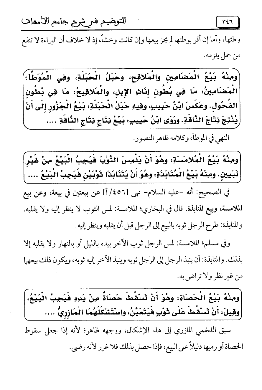 ومنه بيع الملامسة: وهو أن يلمس الثوب فيجب البيع من غير تبيين. ومنه بيع المنابذة: وهو أن يتنابذا ثوبين فيجب البيع ....