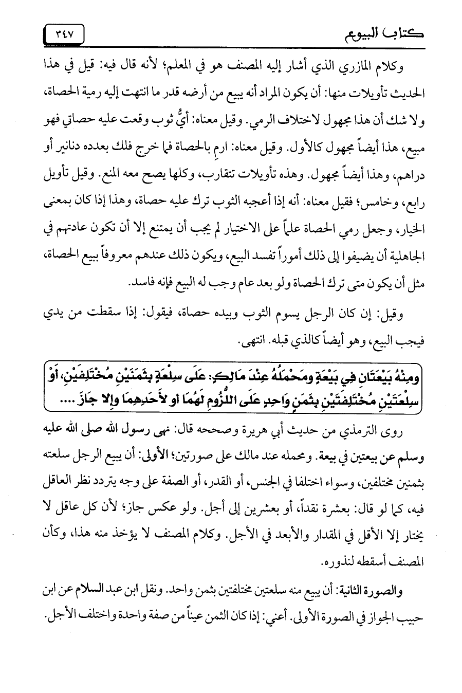 وكلام المازري الذي أشار إليه المصنف هو في المعلم، لأنه قال فيه: قيل في هذا الحديث تأويلات منها: أن يكون المراد أنه يبيع من أرضه قدر ما انتهت إليه رمية الحصاة، ولا شك أن هذا مجهول لاختلاف الرمي. وقيل معناه: أيُّ ثوب وقعت عليه حصاتي فهو مبيع، هذا أيضاً مجهول كالأول. وقيل معناه: ارمِ بالحصاة فما خرج فلك بعدده دنانير أو دراهم، وهذا أيضاً مجهول. وهذه تأويلات تتقارب، وكلها يصح معه المنع. وقيل تأويل رابع، وخامس، فقيل معناه: أنه إذا أعجبه الثوب ترك عليه حصاة، وهذا إذا كان بمعنى الخيارة، وجعل رمي الحصاة علماً على الاختيار لم يجب أن يمتنع إلا أن تكون عادتهم في الجاهلية أن يضيفوا إلى ذلك أموراً تفسد البيع، ويكون ذلك عندهم معروفاً ببيع الحصاة، مثل أن يكون متى ترك الحصاة ولو بعد عام وجب له البيع فإنه فاسد.