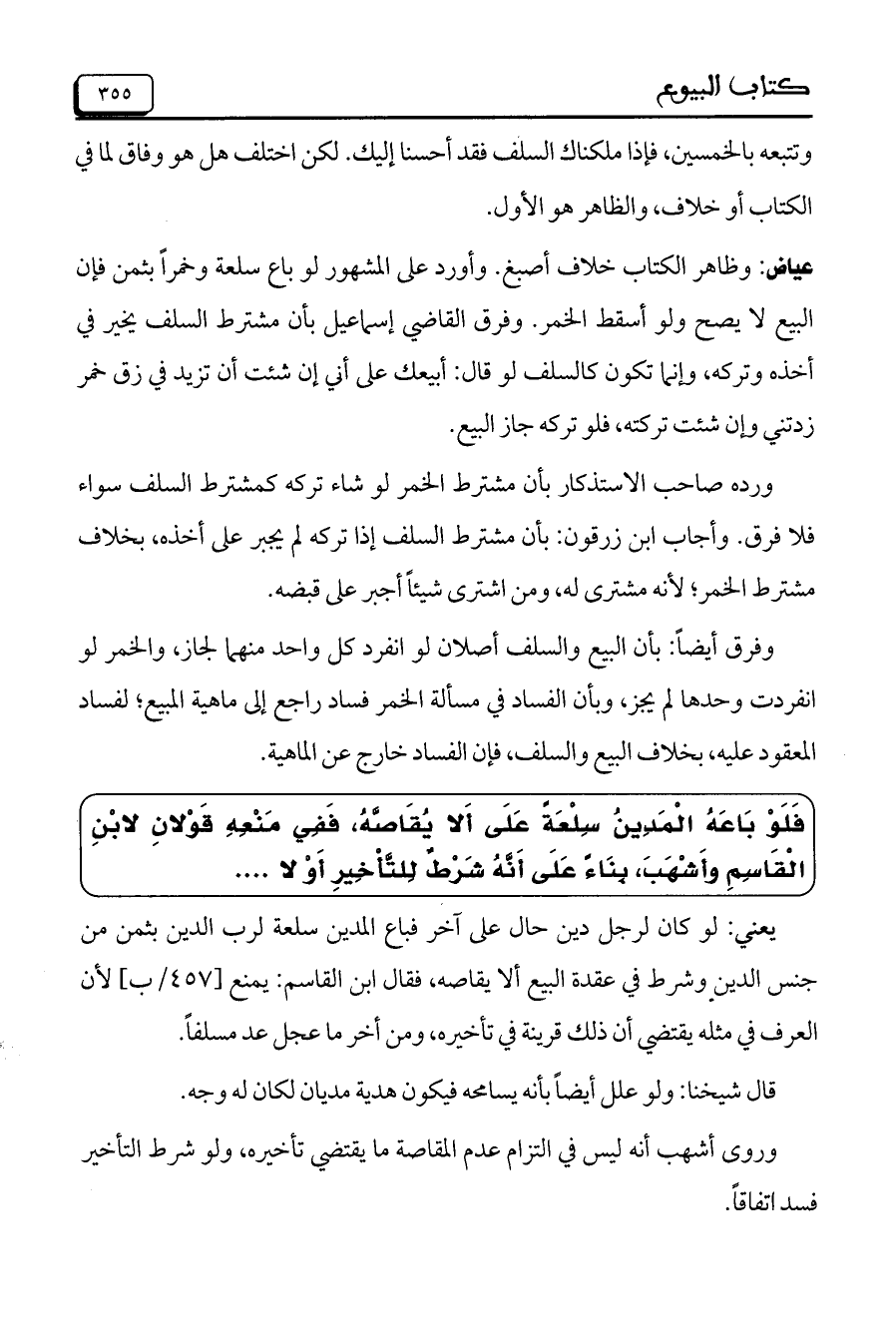 ورده صاحب الاستذكار بأن مشترط الخمر لو شاء تركه كمشترط السلف سواء فلا فرق. وأجاب ابن زرقون: بأن مشترط السلف إذا تركه لم يجبر على أخذه، بخلاف مشترط الخمر، لأنه مشترى له، ومن اشترى شيئاً أجبر على قبضه.