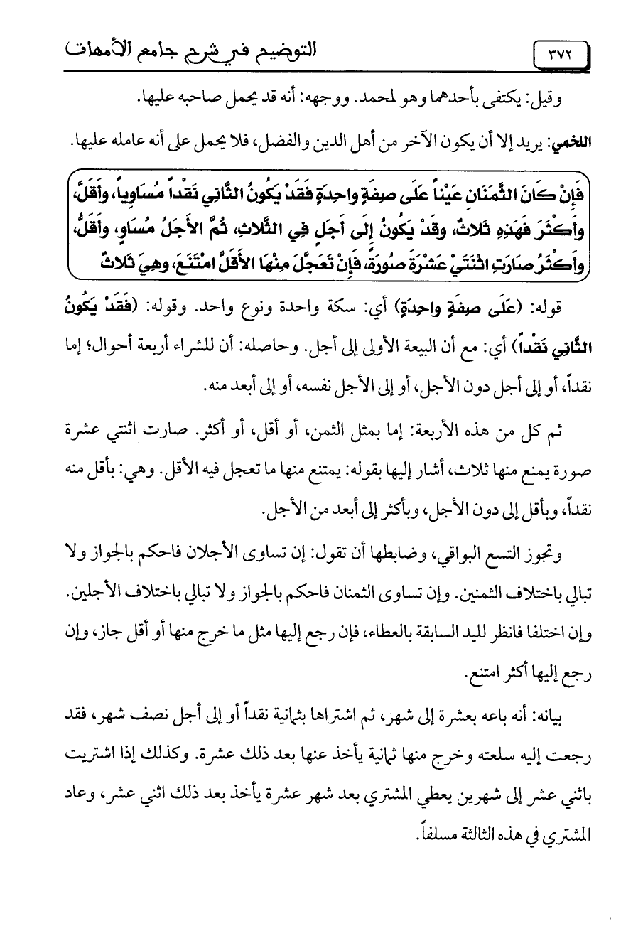 قوله: (على صفة واحدة) أي: سكة واحدة ونوع واحد. وقوله: (فقد يكون الثاني نقداً) أي: مع أن البيعة الأولى إلى أجل. وحاصله: أن للشراء أربعة أحوال، إما نقداً، أو إلى أجل دون الأجل، أو إلى الأجل نفسه، أو إلى أبع منه.