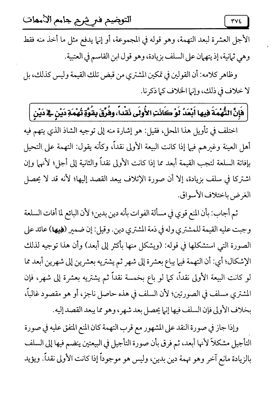 اختلف في تأويل هذا المحل، فقيل: هو إشارة منه إلى توجيه الشاذ الذي يتهم فيه أهل العينة وغيرهم فيما إذا كانت البيعة الأولى نقداً، وكأنه يقول: التهمة على التحيل بإفاتة السلعة لتجب القيمة أبعد مما إذا كانت الأولى نقداً والثانية إلى أجل، لأنهما وإن اشتركا في سلف بزيادة، إلا أن صورة الإتلاف يبعد القصد إليها، لأنه قد لا يحصل الغرض باختلاف الأسواق.