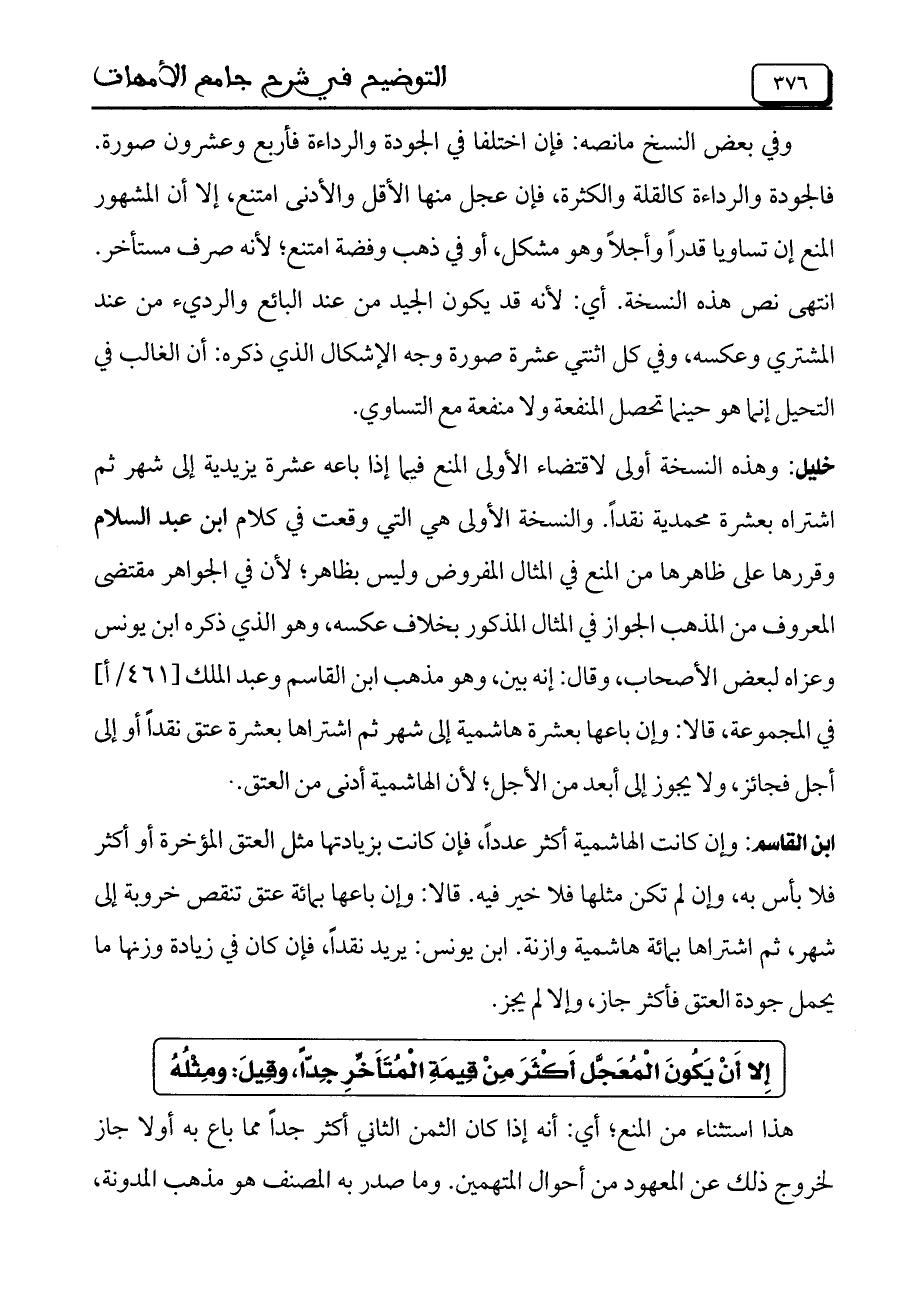 خليل: وهذه النسخة أولى لاقتضاء الأولى المنع فيما إذا باعه عشرة يزيدية إلى شهر ثم اشتراه بعشرة محمدية نقداً. والنسخة الأولى هي التي وقعت في كلام ابن عبد السلام وقررها على ظاهرها من المنع في المثال المفروض وليس بظاهر، لأن في الجواهر مقتضى المعروف من المذهب الجواز في المثال المذكور بخلاف عكسه، وهو الذي ذكره ابن يونس وعزاه لبعض الأصحاب، وقال: إنه بين، وهو مذهب ابن القاسم وعبد الملك [461/أ] في المجموعة، قالا: وإن باعها بعشرة هامشية إلى شهر ثم اشتراها بعشرة عتق نقداً أو إلى أجل فجائز، ولا يجوز إلى أبعد من الأجل، لأن الهاشمية أدنى من العتق.