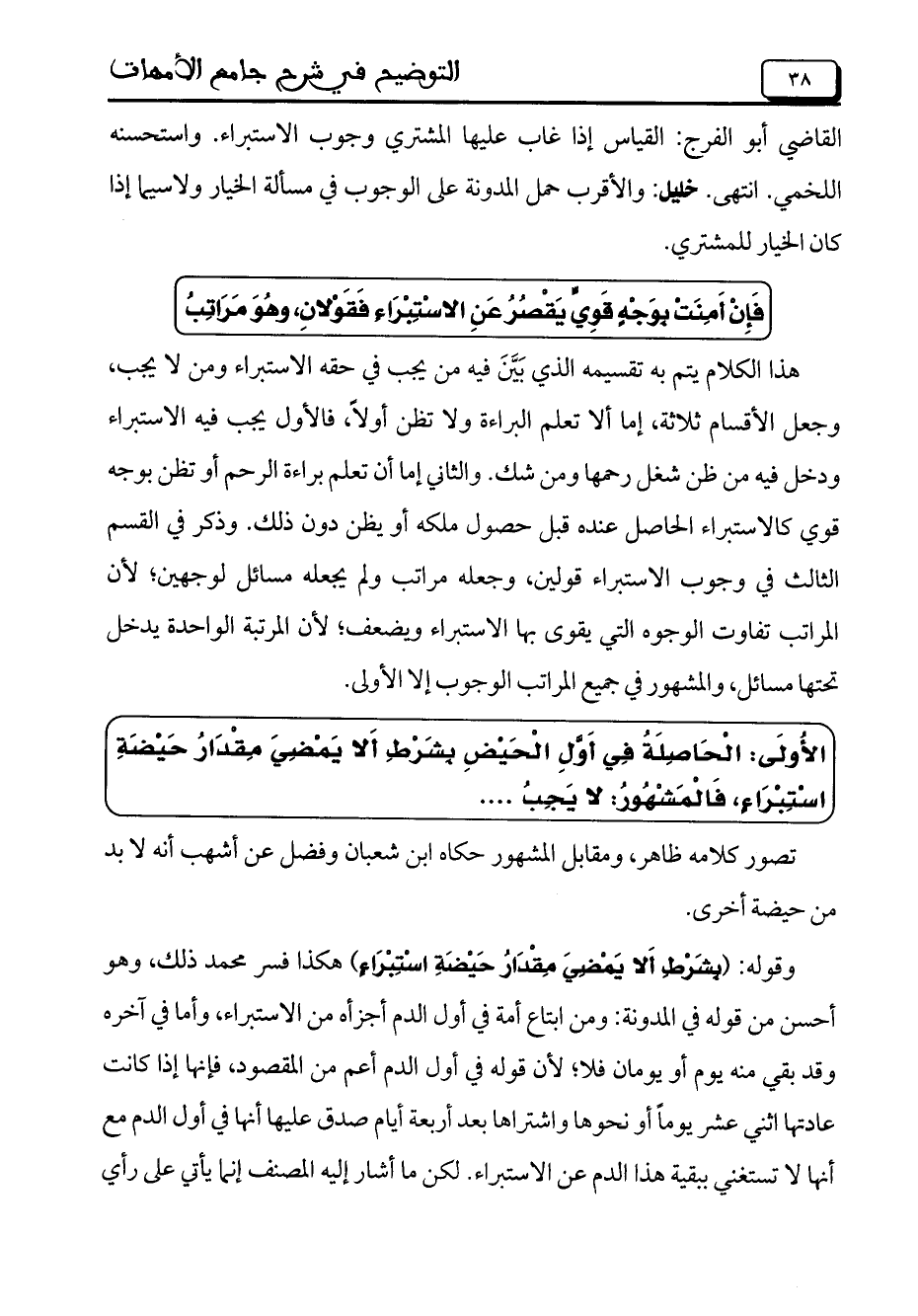 هذا الكلام يتم به تقسيمه الذي بين فيه من يجب في حقه الاستبراء ومن لا يجب، وجعل الأقسام ثلاثة، إما ألا تعلم البراءة ولا تظن أولاً، فالأول يجب فيه الاستبراء ودخل فيه من ظن شغل رحمها ومن شك. والثاني إما أن تعلم براءة الرحم أو تظن بوجه قوي كالاستبراء الحاصل عنده قبل حصول ملكه أو يظن دون ذلك. وذكر في القسم الثالث في وجوب الاستبراء قولين، وجعله مراتب ولم يجعله مسائل لوجهين، لأن المراتب تفاوت الوجوه التي يقوى بها الاستبراء ويضعف، لأن المرتبة الواحدة يدخل تحتها مسائل، والمشهور في جميع المراتب الوجوب إلا الأولى.