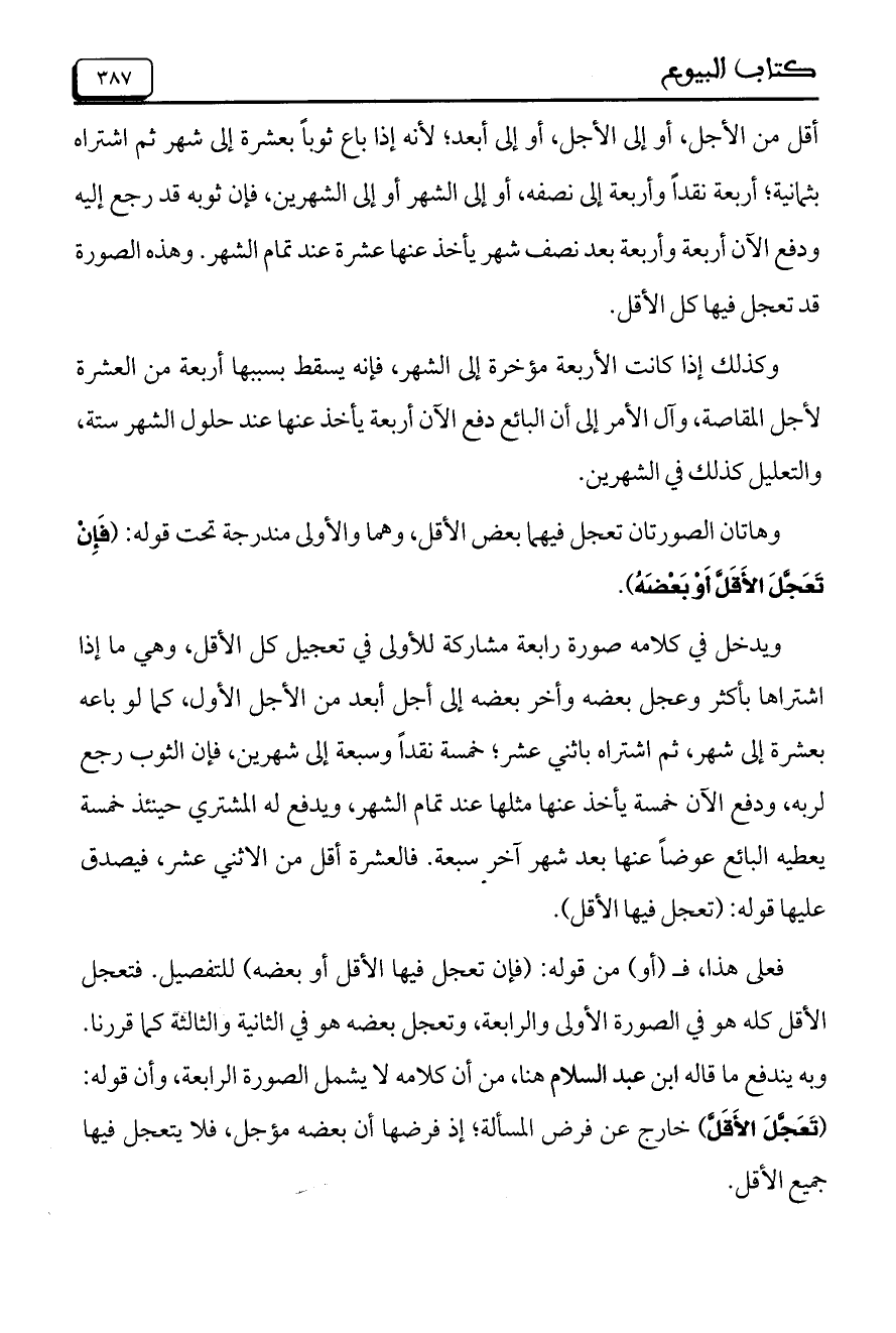 ويدخل في كلامه صورة رابعة مشاركة للأولى في تعجيل كل الأقل، وهي ما إذا اشتراها بأكثر وعجل بعضه وأخر بعضه إلى أجل أبعد من الأجل الأول، كما لو باعه بعشرة إلى شهر، ثم اشتراه باثني عشر، خمسة نقداً وسبعة إلى شهرين، فإن الثوب رجع لربه، ودفع الآن خمسة يأخذ عنها مثلها عند تمام الشهر، ويدفع له المشتري حينئذ خمسة يعطيه البائع عوضاً عنها بعد شهر آخر سبعة. فالعشرة أقل من الاثني عشر، فيصدق عليها قوله: (تعجل فيها الأقل). فعلى هذا، فـ (أو) من قوله: (فإن تعجل فيها الأقل أو بعضه) للتفصيل. فتعجل الأقل كله هو في الصورة الأولى والرابعة، وتعجل بعضه هو في الثانية والثالثة كما قررنا. وبه يندفع ما قاله ابن عبد السلام هنا، من أن كلامه لا يشمل الصورة الرابعة، وأن قوله: (تعجل الأقل) خارج عن فرض المسألة، إذ فرضها أن بعضه مؤجل، فلا يتعجل فيها جميع الأقل.