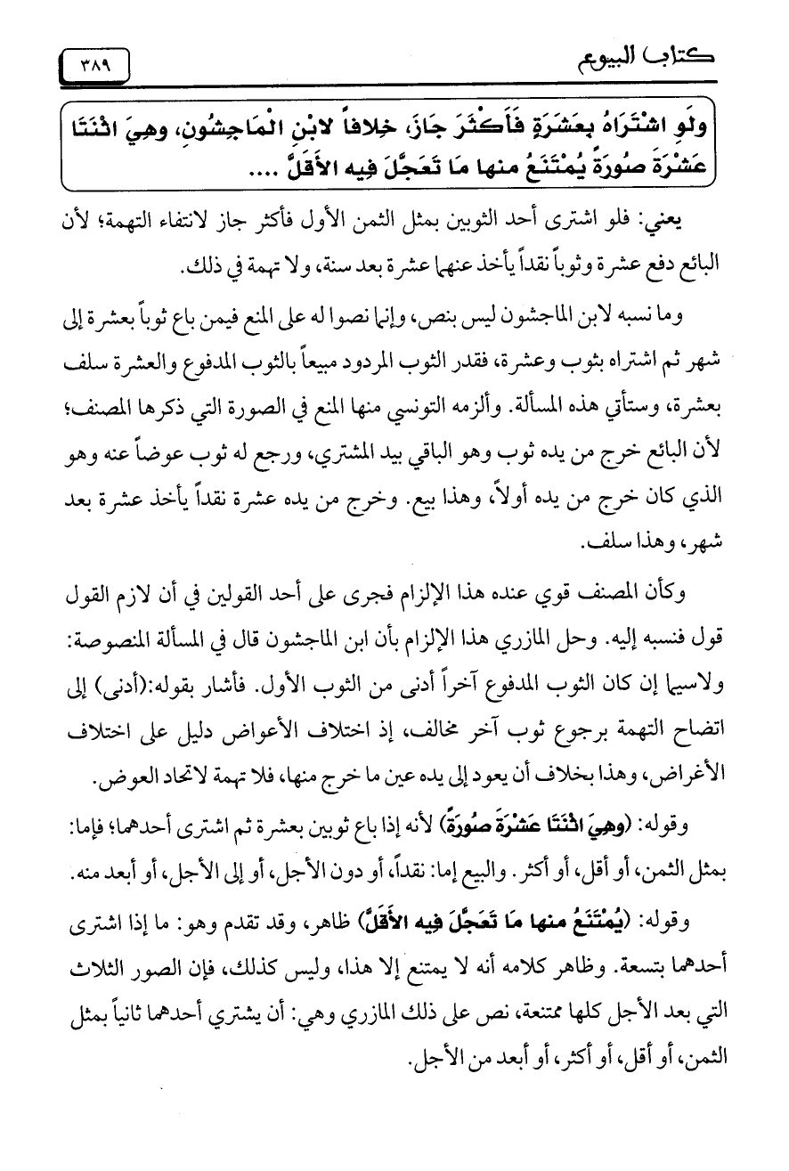 وقوله: (يمتنع منها ما تعجل فيه الأقل) ظاهر، وقد تقدم وهو: ما إذا اشترى أحدهما بتسعة. وظاهر كلامه أنه لا يمتنع إلا هذا، وليس كذلك، فإن الصور الثلاث التي بعد الأجل كلها ممتنعة، نص على ذلك المازري وهي: أن يشتري أحدهما ثانياً بمثل الثمن أو أقل، أو أكثر، أو أبعد من الأجل.