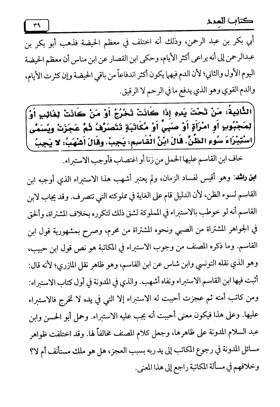 أبي بكر بن عبد الرحمن، وذلك أنه اختلف في معظم الحيضة فذهب أبو بكر بن عبد الرحمن إلى أنه يراعى أكثر الأيام، وحكى ابن القصار عن ابن مناس أن معظم الحيضة اليوم الأول والثاني، لأن الدم فيهما يكون أكثر اندفاعاً من باقي الحيضة وإن كثرت الأيام، والدم القوي وهو الذي يدفع ما في الرحم لا الرقيق.