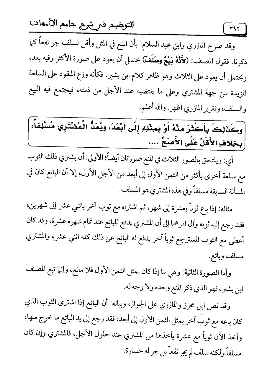 وقد صرح المازري وابن عبد السلام: بأن المع في المثل وأقل لسلف جر نفعاً كما ذكرنا. فقول المصنف: (لأنه بيع وسلف) يحتمل أن يعود على صورة الأكثر وفيه بعد، ويحتمل أن يعود على الثلاث وهو ظاهر كلام ابن بشير. فكأنه وزع المنقود على السلعة المزيدة من جهة المشتري وعلى ما يقتضيه عند الأجل من ذمته، فيجتمع فيه البيع والسلف، وتقرير المازري أظهر. والله أعلم.