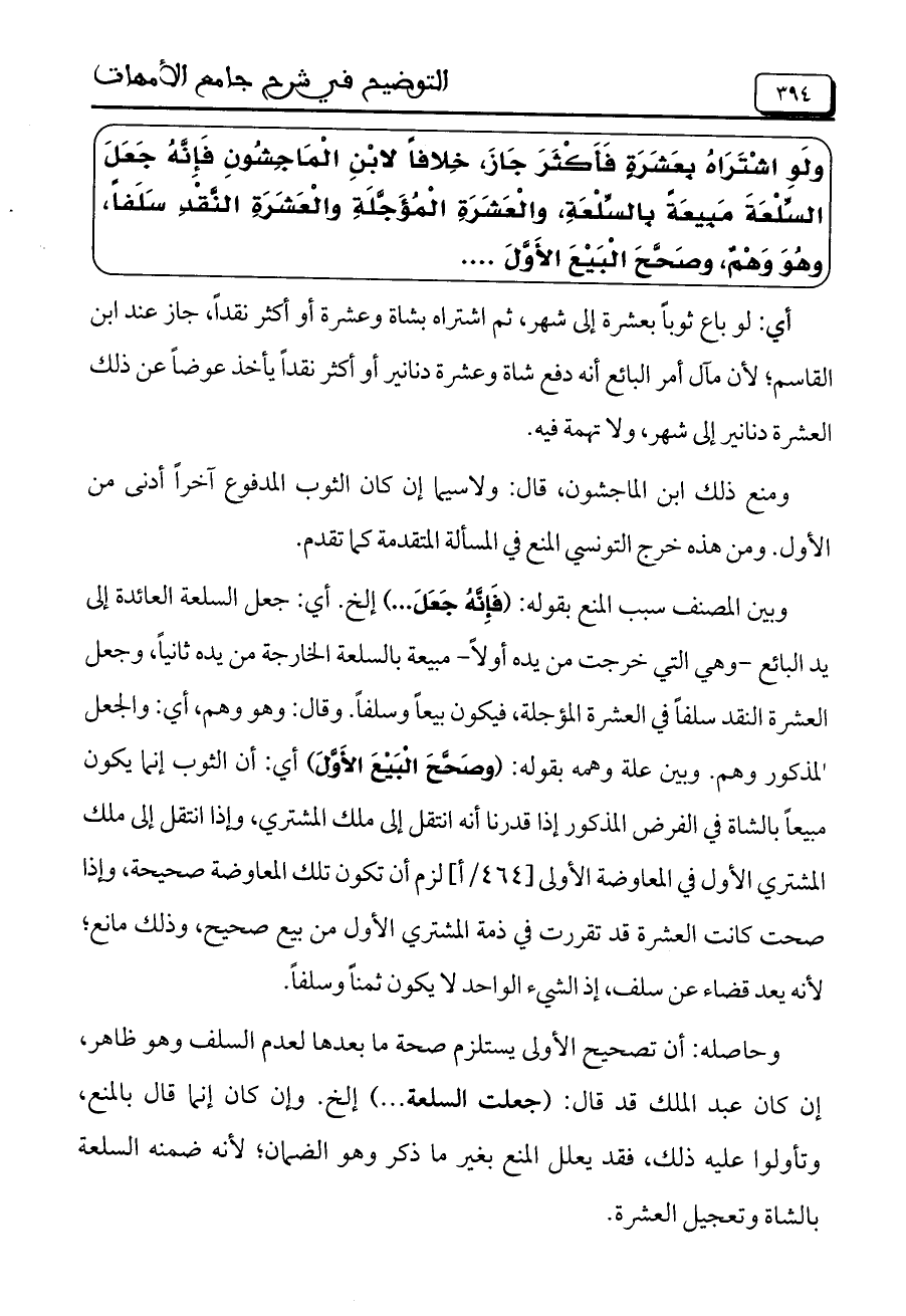 ومنع ذلك ابن الماجشون، قال: ولاسيما إن كان الثوب المدفوع آخراً أدنى من الأول. ومن هذه خرج التونسي المنع في المسألة المتقدمة كما تقدم. وبين المصنف سبب المنع بقوله: (فإنه جعل ....) إلخ. أي: جعل السلعة العائدة إلى يد البائع- وهي التي خرجت من يده أولاً- مبيعة بالسلعة الخارجة من يده ثانياً، وجعل العشرة النقد سلفاً في العشرة المؤجلة، فيكون بيعاً وسلفاً. وقال: وهو وهم، أي: والجعل المذكور وهم. وبين علة وهمه بقوله: (وصحح البيع الأول) أي: أن الثوب إنما يكون مبيعاً بالشاة في الفرض المذكور إذا قدرنا أنه انتقل إلى ملك المشتري، وإذا انتقل إلى ملك المشتري الأول في المعارضة الأولى [464/أ] لزم أن تكون تلك المعاوضة صحيحة، وإذا صحت كانت العشرة قد تقررت في ذمة المشتري الأول من بيع صحيح، وذلك مانع، لأنه يعد قضاء عن سلف، إذ الشيء الواحد لا يكون ثمناً وسلفاً.