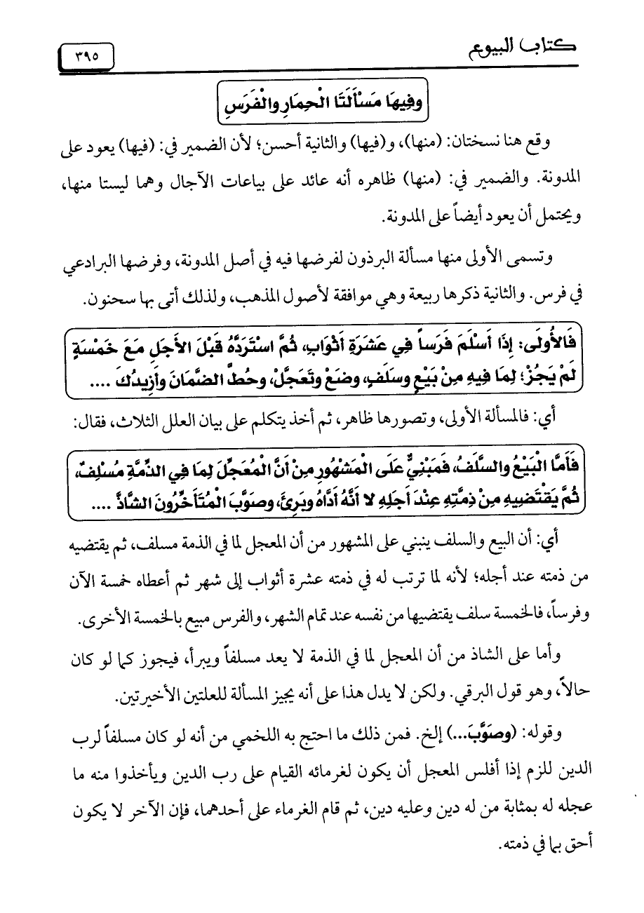 وقع هنا نسختان: (منها)، و (فيها) والثانية أحسن، لأن الضمير في: (فيها) يعود على المدونة. والضمير في: (منها) ظاهره أنه عائد على بياعات الآجال وهما ليستا منها، ويحتمل أن يعود أيضاً على المدونة. وتسمى الأولى منها مسألة البرذون لفرضها فيه في أصل المدونة، وفرضها البرادعي في فرس. والثانية ذكرها ربيعة وهي موافقة لأصول المذهب، ولذلك أتى بها سحنون.