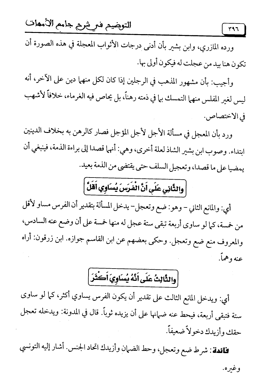 وأجيب: بأن مشهور المذهب في الرجلين إذا كان لكل منهما دين على الآخر، أنه ليس لغير المفلس منهما التمسك بما في ذمته رهناً، بل يحاص فيه الغرماء، خلافاً لأشهب في الاختصاص. ورد بأن المعجل في مسألة الأجل لأجل المؤجل فصار كالرهن به بخلاف الدينين ابتداء. وصوب ابن بشير الشاذ لعله أخرى، وهي: أنهما قصدا إلى براءة الذمة، فينبغي أن يمضيا على ما قصدا، وتعجيل السلف حتى يقتضي من الذمة بعيد.
