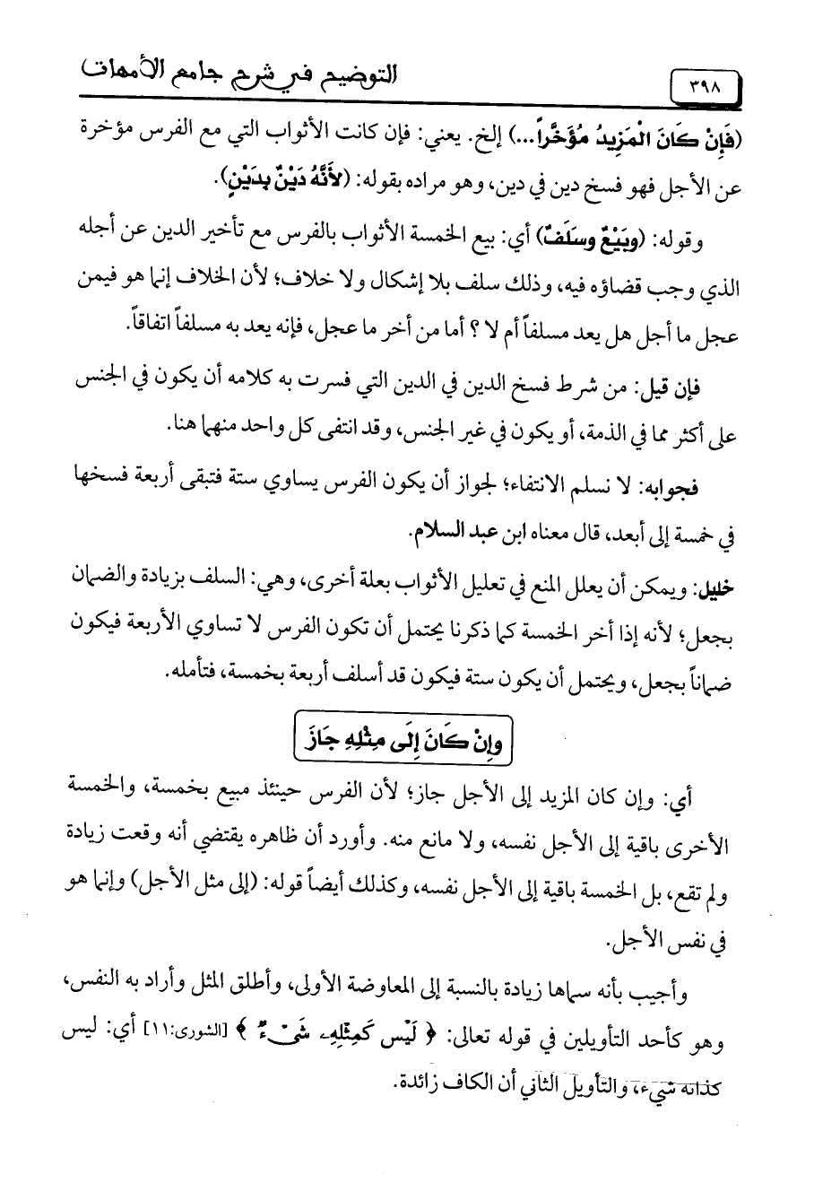 خليل: ويمكن أن يعلل المنع في تعليل الأثواب بعلة أخرى، وهي: السلف بزيادة والضمان بجعل، لأنه إذا أخر الخمسة كما ذكرنا يحتمل أن تكون الفرس لا تساوي الأربعة فيكون ضماناً بجعل، ويحتمل أن يكون ستة فيكون قد أسلف أربعة بخمسة، فتأمله.