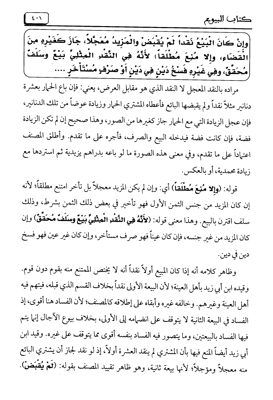 قوله: (وإلا منع مطلقاً) أي: وإن لم يكن المزيد معجلاً بل تأخر امتنع مطلقاً، لأنه إن كان المزيد من جنس الثمن الأول فهو تأخير في بعض ذلك الثمن بشرط، وذلك سلف اقترن بالبيع. وهذا معنى قوله: (لأنه في النقد المثلي بيع وسلف محقق) وإن كان المزيد من غير جنسه، فإن كان عيناً فهو صرف مستأخر، وإن كان غير عين فهو فسخ دين في دين.