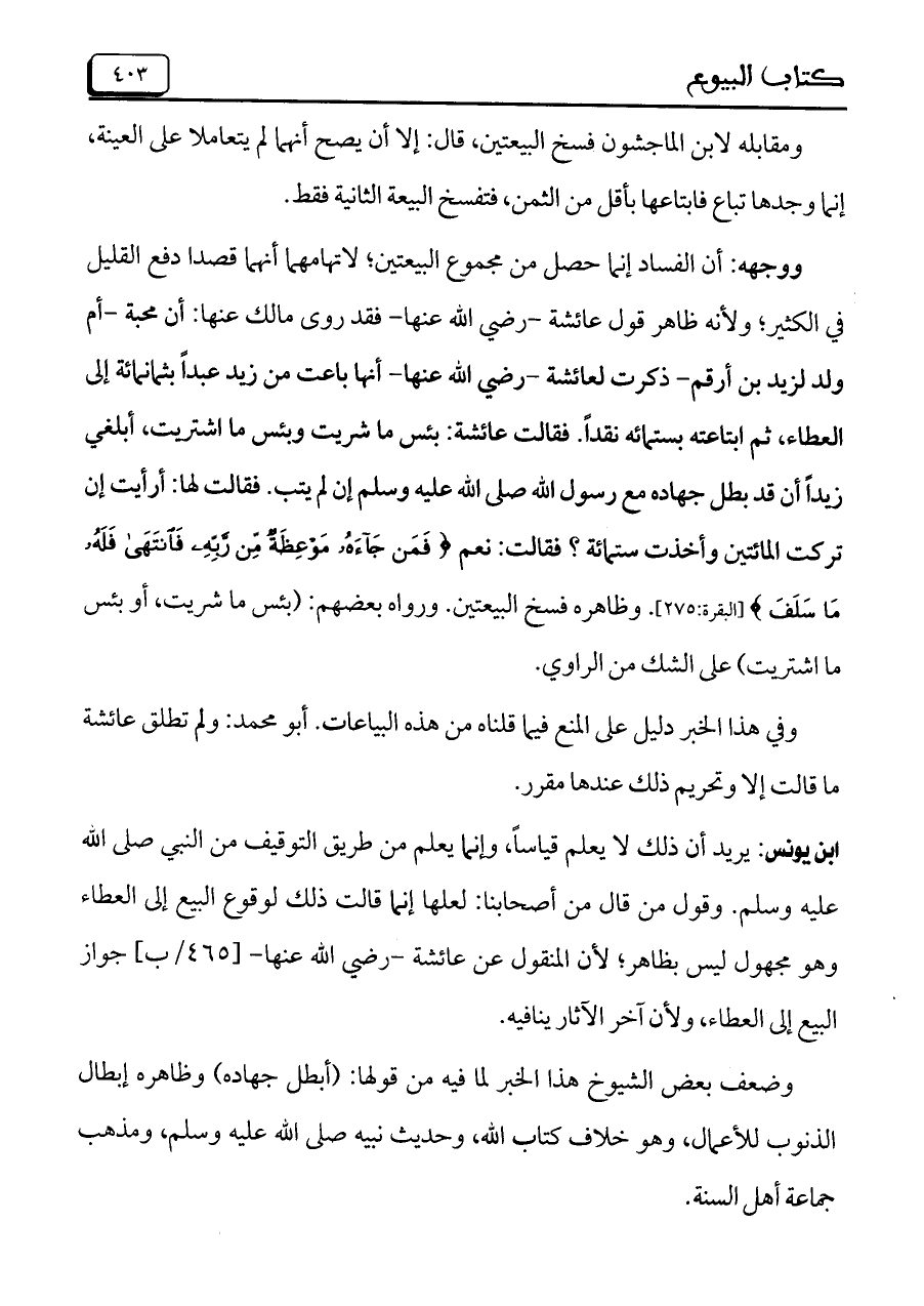 ووجهه: أن الفساد إنما حصل من مجموع البيعتين، لاتهامهما أنهما قصدا دفع القليل في الكثير، ولأنه ظاهر قول عائشة- رضي الله عنها- فقد روى مالك عنها: أن محبة- أم ولد لزيد بن أرقم- ذكرت لعائشة- رضي الله عنها- أنها باعت من زيد عبداً بثمانمائة إلى العطاء، ثم ابتاعته بستمائة نقداً. فقالت عائشة: بئس ما شريت وبئس ما اشتريت، أبلغي زيداً أن قد بطل جهاده مع رسول الله صلى الله عليه وسلم إن لم يتب. فقالت لها: أرأيت إن تركت المائتين وأخذت ستمائة؟ فقالت: نعم {فَمَنْ جَاءَهُ مَوْعِظَةٌ مِنْ رَبِّهِ فَانْتَهَى فَلَهُ مَا سَلَفَ} [البقرة:275] وظاهره فسخ البيعتين. ورواه بعضهم: (بئس ما شريت، أو بئس ما اشتريت) على الشك من الرواي.