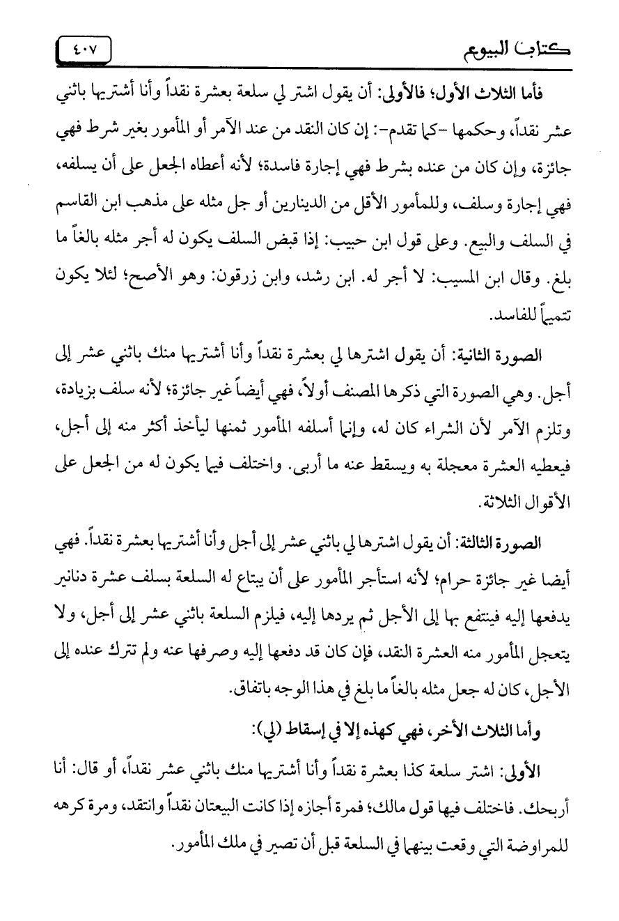 فأما الثلاث الأول، فالأولى: أن يقول اشتر لي سلعة بعشرة نقداً وأنا أشتريها باثني عشر نقداً، وحكمها- كما تقدم-: إن كان النقد من عند الآمر أو المأمور بغير شرط فهي جائزة، وإن كان من عنده بشرط فهي إجارة فاسدة، لأنه أعطاه الجعل على أن يسلفه، فهي إجارة وسلف، وللمأمور الأقل من الدينارين أو جل مثله على مذهب ابن القاسم في السلف والبيع. وعلى قول ابن حبيب: إذا قبض السلف يكون له أجر مثله بالغاً ما بلغ. وقال ابن المسيب: لا أجر له. ابن رشد، وابن زرقون: وهو الأصح، لئلا يكون تتميماً للفاسد.