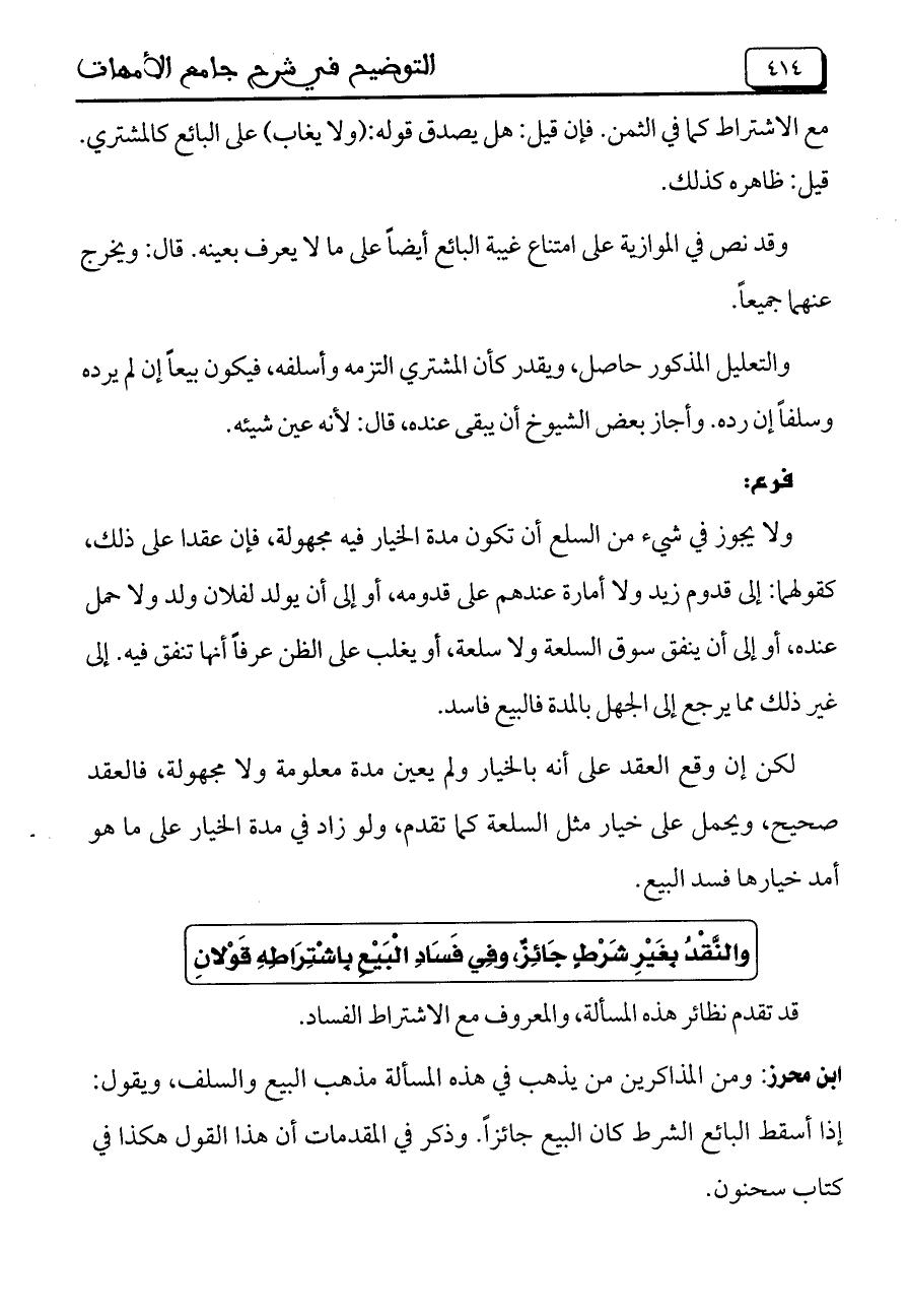 ابن محرز: ومن المذاكرين من يذهب في هذه المسألة مذهب البيع والسلف، ويقول: إذا أسقط البائع الشرط كان البيع جائزاً. وذكر في المقدمات أن هذا القول هكذا في كتاب سحنون.