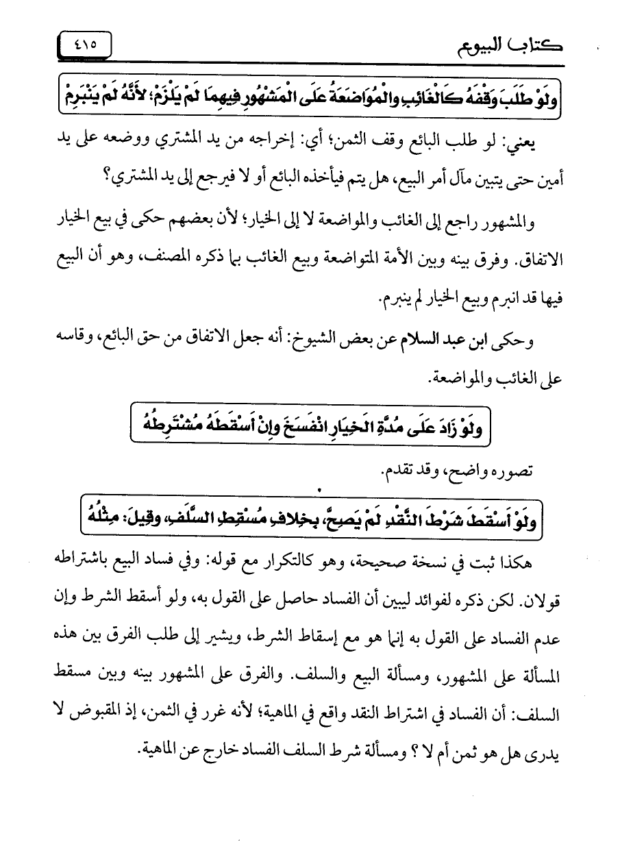 هكذا ثبت في نسخة صحيحة، وهو كالتكرار مع قوله: وفي فساد باشتراطه قولان. لكن ذكره لفوائد ليبين أن الفساد حاصل على القول به، ولو أسقط الشرط وإن عدم الفساد على القول به إنما هو مع إسقاط الشرط، ويشير على طلب الفرق بين هذه المسألة على المشهور، ومسألة البيع والسلف. والفرق على المشهور بينه وبين مسقط السلف: أن الفساد في اشتراط النقد واقع في الماهية، لأنه غرر في الثمن، إذ المقبوض لا يدرى هل هو ثمن أم لا؟ ومسألة شرط السلف الفساد خارج عن الماهية.