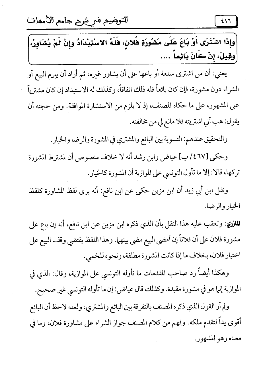 المازري: وتعقب عليه هذا النقل بأن الذي ذكره ابن مزين ع ابن نافع، أنه إن باع على مشورة فلان على أن فلاناً إن أمضى البيع مضى بينهما. وهذا اللفظ يقتضي وقف البيع على اختيار فلان، بخلاف ما إذا كانت المشورة مطلقة، ونحوه للخمي.