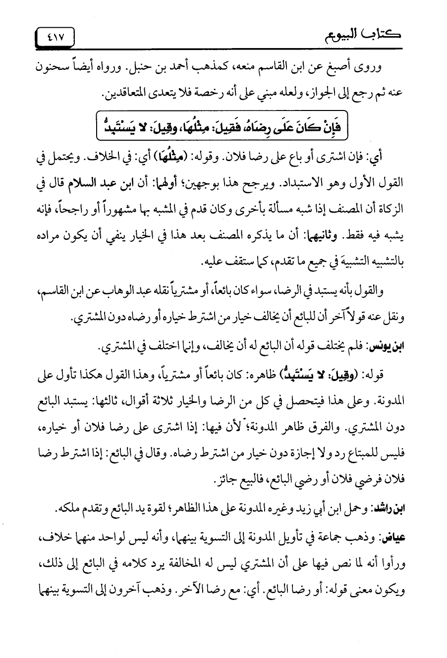 ابن رشد: وحمل بن أبي زيد وغيره المدونة على هذا الظاهر، لقوة يد البائع وتقدم ملكه.