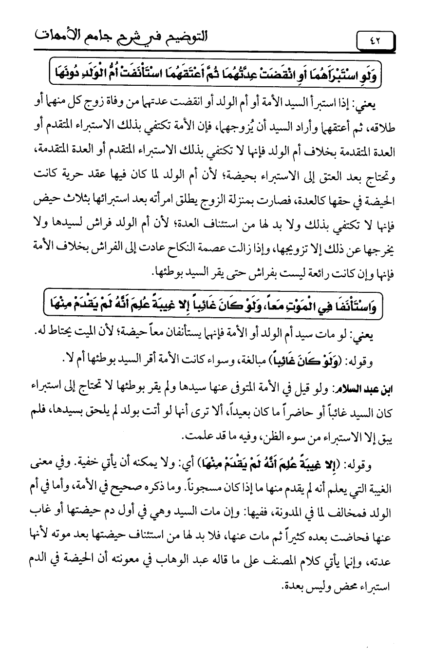 ابن عبد السلام: ولو قيل في الأمة المتوفى عنها سيدها ولم يقر بوطئها لا تحتاج إلى استبراء كان السيد غائباً أو حاضراً ما كان بعيداً، ألا ترى أنها لو أتت بولد لم يلحق بسيدها، فلم يبق إلا الاستبراء من سوء الظن، وفيه ما قد علمت.