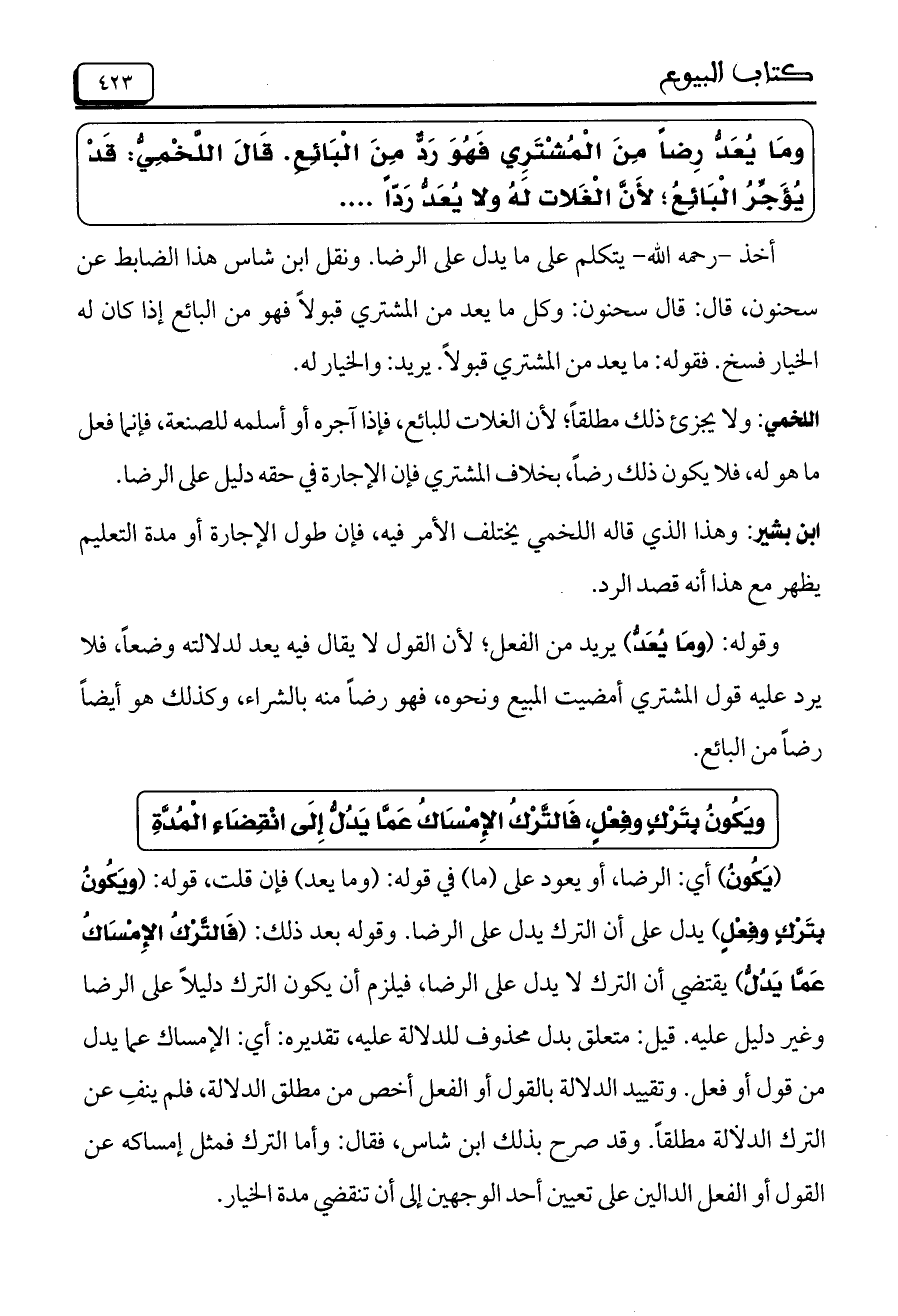 أجاب- رحمه الله- يتكلم على ما يدل على الرضا. ونقل ابن شاس هذا الضابط عن سحنون، قال: قال سحنون: وكل ما يعد من المشتري قبولاً فهو من البائع إذا كان له الخيار فسخ. فقوله: ما يعد من المشتري قبولاً. يريد: والخيار له.