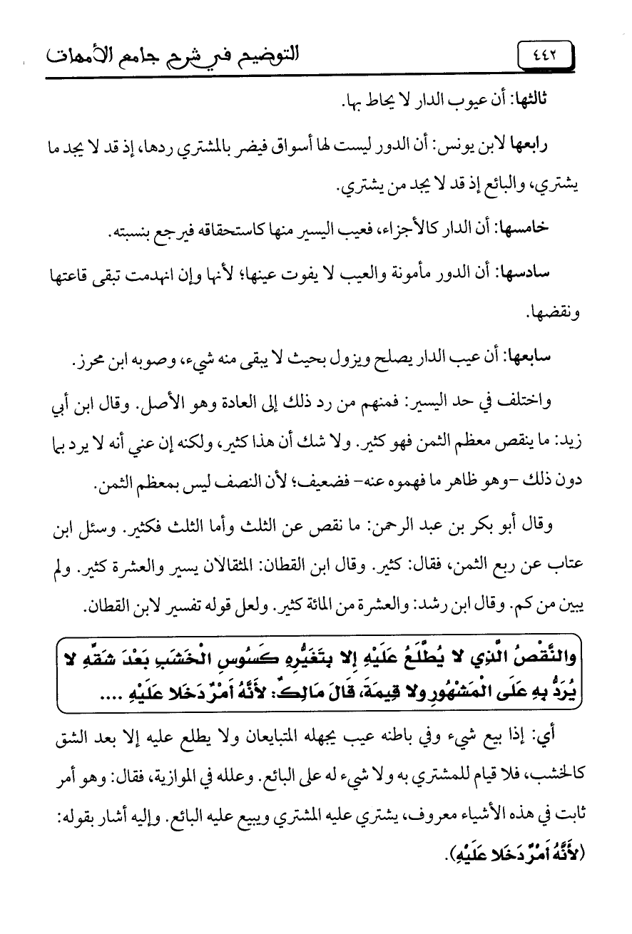 رابعها لابن يونس: أن الدور ليست لها أسوا فيضر بالمشتري ردها، إذ قد لا يجد ما يشتري، والبائع إذ قد لا يجد من يشتري.