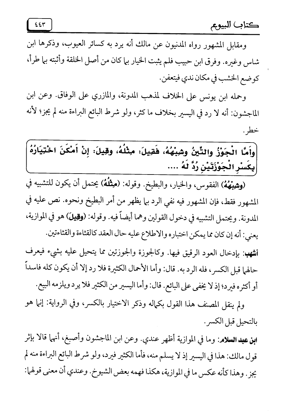 ابن عبد السلام: وما في الموازية أظهر عندي. وعن ابن الماجشون وأصبغ، أنهما قالا بإثر قول مالك: هذا في اليسير منه، فأما الكثير فيرد، ولو شرط البائع البراءة منه لم يجز. وهذا كأنه عكس ما في الموازية، هكذا فهمه بعض الشيوخ. وعندي أن معنى قولهما: