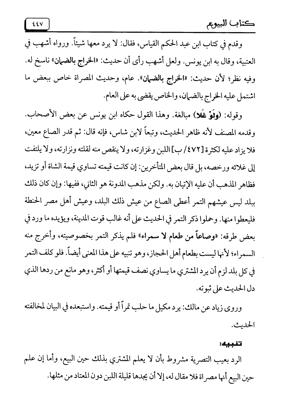 وقدم في كتاب ابن عبد الحكم القياس، فقال: لا يرد معها شيئاً. ورواه أشهب في العتبية، وقال به ابن يونس. ولعل أشهب رأى أن حديث: (الخراج بالضمان) ناسخ له. وفيه نظر، لأن حديث: (الخراج بالضمان). عام، وحديث المصراة خاص ببعض ما اشتمل عليه الخراج بالضمان، والخاص يقضى به على العام.