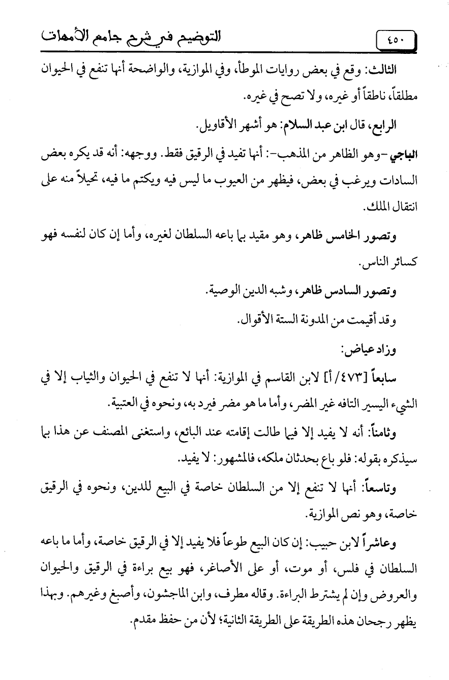 وتاسعاً: أنها لا تنفع إلا من السلطان خاصة في البيع للدين، ونحوه في الرقيق خاصة، وهو نص الموازية