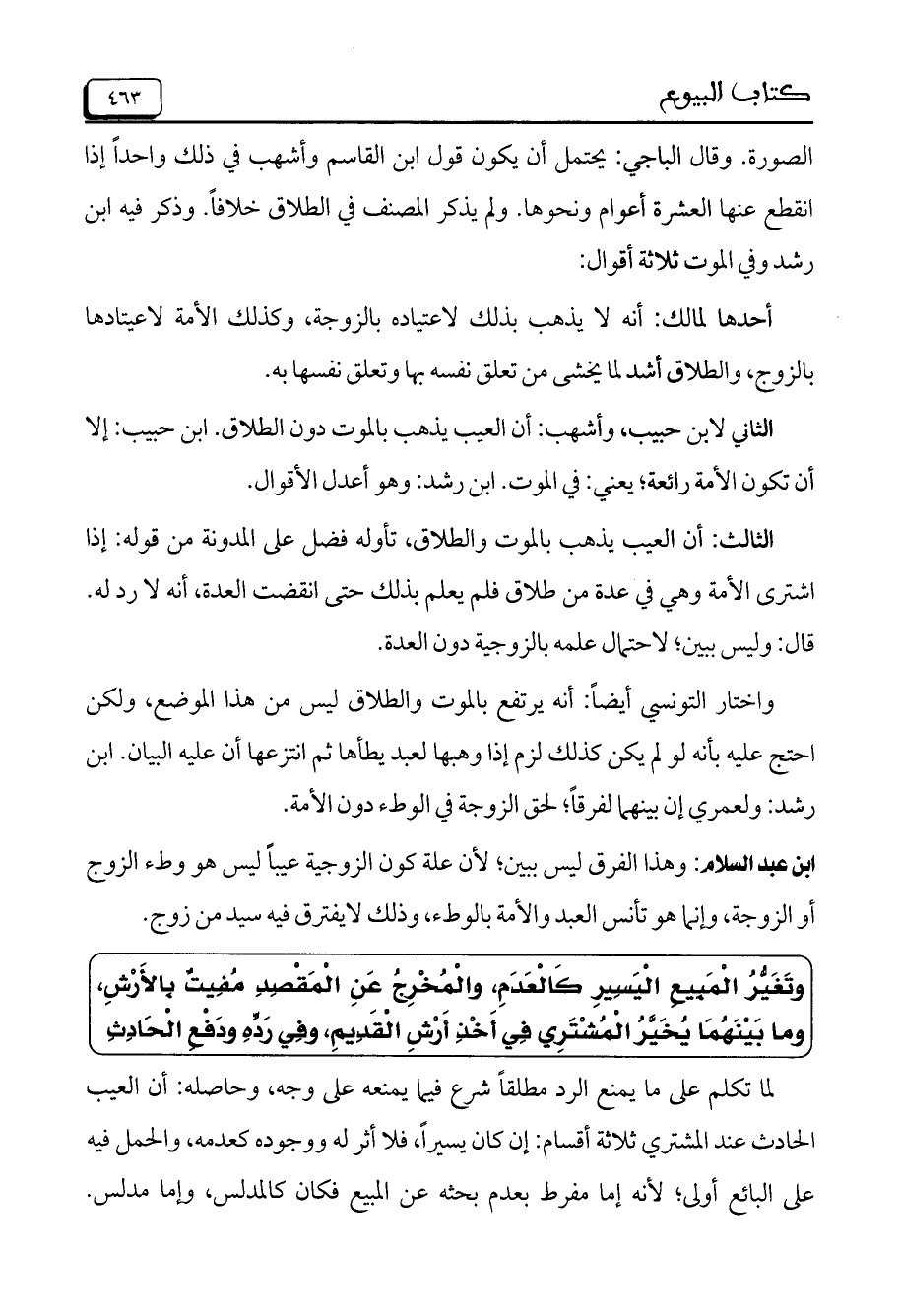 ابن عبد السلام: وهذا الفرق ليس ببين، لأن علة كون الزوجية عيباً ليس هو وطء الزوج أو الزوجة، وإنما هو تأنس العبد والأمة بالوطء، وذلك لا يفترق فيه سيد من زوج.