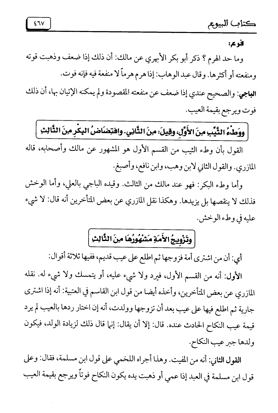 وما حد الهرم؟ ذرك أبو بكر الابهري عن مالك: أن ذلك إذا ضعف وذهبت قوته ومنفعته أو أكثرها. وقال عبد الوهاب: إذ هرم هرماً لا منفعة فيه فإنه فوت.