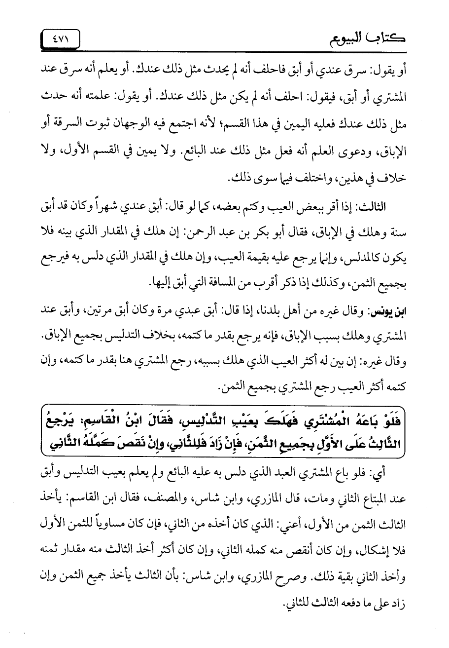 الثالث: إذا أقر ببعض العيب وكتم بعضه، كما لو قال: أبق عندي شهراً وكان قد أبق سنة وهلك في الإباق، فقال أبو بكر بن عبد الرحمن: إن هلك في المقدار الذي بينه فلا يكون كالمدلس، وإنما يرجع عليه بقيمة العيب، وإن هلك في المقدار الذي دلس به فيرجع بجميع الثمن، وكذلك إذا ذكر أقرب من المسافة التي أبق إليها.