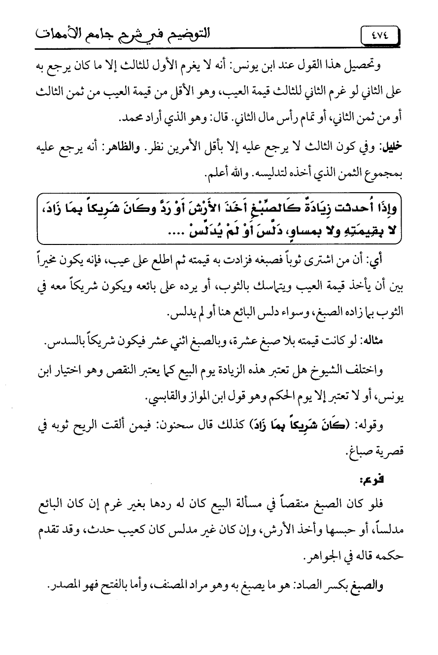 أي: أن من اشترى ثوباً فصبغه فزادت به قيمته ثم اطلع على عيب، فإنه يكون مخيراً بين أن يأخذ قيمة العيب ويتماسك بالثوب، أو يرده على بائعه ويكون شريكاً معه في الثوب بما زاده الصبغ، وسواء دلس البائع هنا أو لم يدلس.