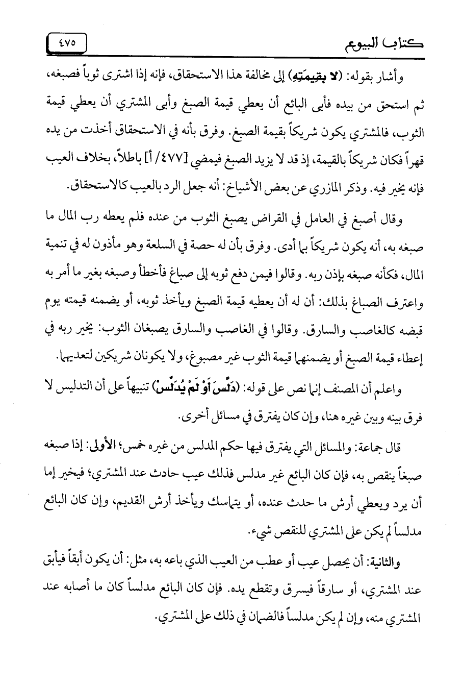 قال جماعة: والمسائل التي يفترق فيها حكم المدلس من غيره خمس، الأولى: إذا صبغه صبغاً ينقص به، فإن كان البائع غير مدلس فذلك عيب حادث عند المشتري، فيخير إما أن يرد ويعطي أرش ما حدث عنده، أو يتماسك ويأخذ ارش القديم، وإن كان البائع مدلساً لم يكن على المشتري للنقص شيء.