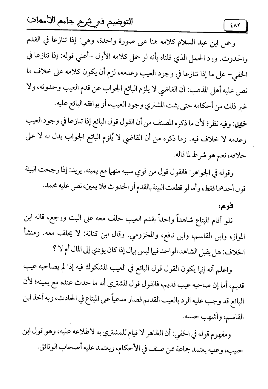 وحمل ابن عبد السلام كلامه هنا على صورة واحدة، وهي: إذا تنازعا في القدم والحدوث. ورد الحمل الذي قلناه بأنه لو حمل كلامه الأول- أعني قوله: إذا تنازعا في الخفي- على ما إذا تنازعا في وجود العيب وعدمه، لزم أن يكون كلامه على خلاف ما نص عليه أهل المذهب: أن القاضي لا يلزم البائع الجواب عن قدم العيب وحدوثه، ولا غير ذلك من أحكامه حتى يثبت المشتري وجود العيب، أو يوافقه البائع عليه.