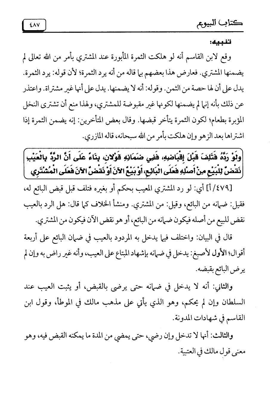 وقع لابن القاسم أنه لو هلكت الثمرة المأبورة عند المشتري بأمر من الله تعالى لم يضمنها المشتري. فعارض هذا بعضهم بما قاله من أنه يرد الثمرة، لأن قوله: يرد الثمرة. يدل على أن لها حصة من الثمن. وقوله: أنه لا يضمنها. يدل على أنها غير مشتراة. واعتذر عن ذلك بأنه إنما لم يضمنها لكونها غير مقبوضة للمشتري، ولهذا منع أن تشترى النخل المؤبرة بطعام، لكون الثمرة يتأخر قبضها. وقال بعض المتأخرين: إنه يضمن الثمرة إذا اشتراها بعد الزهور وإن هلكت بأمر من الله سبحانه، قاله المازري.