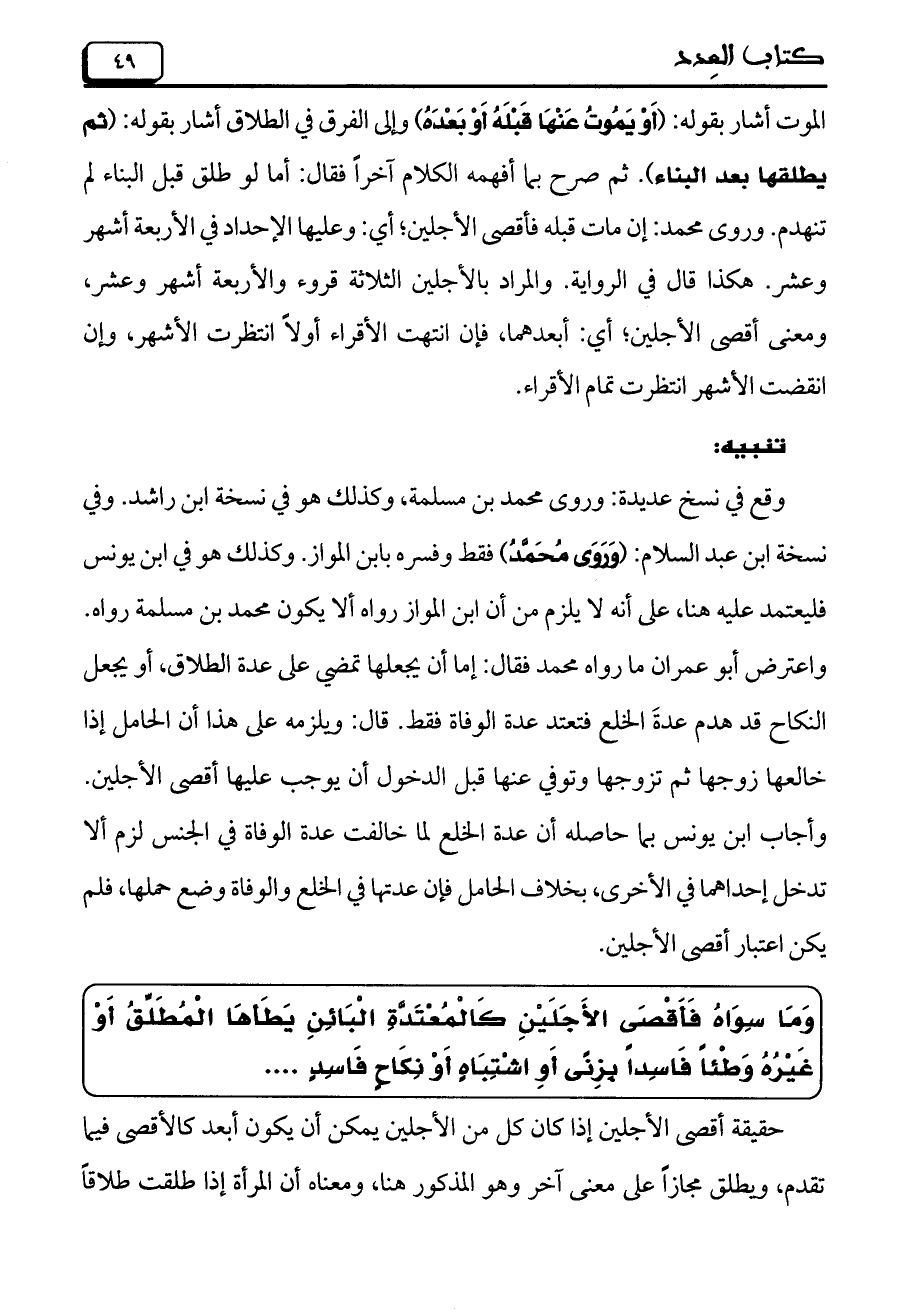 وقع في نسخ عديدة: وروى محمد بن مسملة، وكذلك هو في نسخة ابن راشد. وفي نسخة ابن عبد السلام: (وَرَوَى مُحَمَّدُ) فقط وفسره بابن المواز. وكذلك هو في ابن يونس فليعتمد عليه هنا، على أنه لا يلزم من أن ابن المواز رواه ألا يكون محمد بن مسلمة رواه. واعترض أبو عمران ما رواه محمد فقال: إما أن يجعلها تمضي على عدة الطلاق، أو يجعل النكاح قد هم عدة الخلع فتعتد الوفاة فقط. قال: ويلزمه على هذا أن الحامل إذا خالعها زوجها ثم تزوجها وتوفي عنها قبل الدخول أن يوجب عليها أقصى الأجلين. وأجاب ابن يونس بما حاصله أن عدة الخلع لما خالفت عدة الوفاة في الجنس لزم ألا تدخل إحداهما في الأخرى، بخلاف الحامل فإن عدتها في الخلع والوفاة وضع حملها، فلم يكن اعتبار أقصى الأجلين.