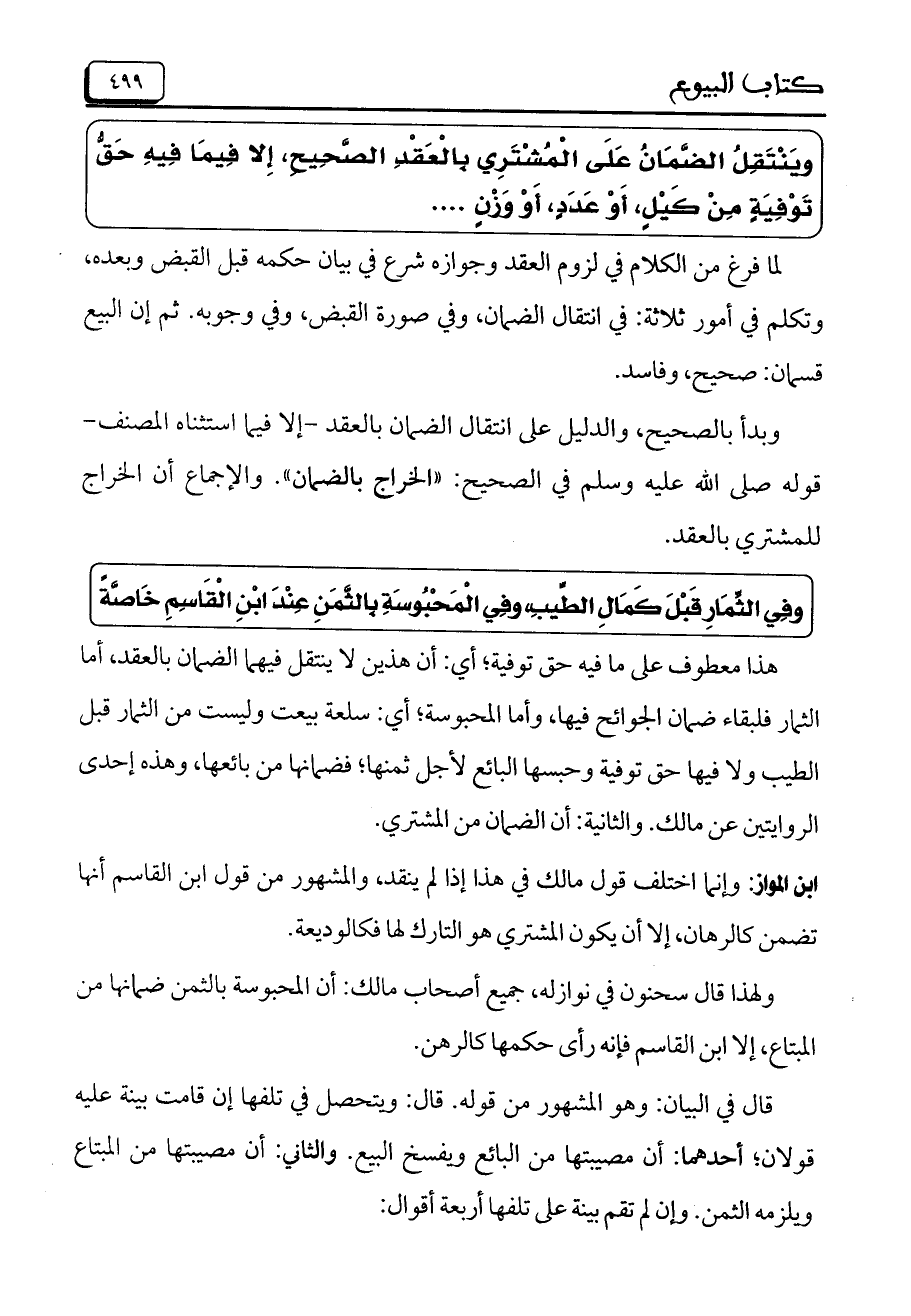 وينتقل الضمان على المشتري بالعقد الصحيح، إلا فيما فيه حق توفيه من كيل، أو عدد، أو وزن ....