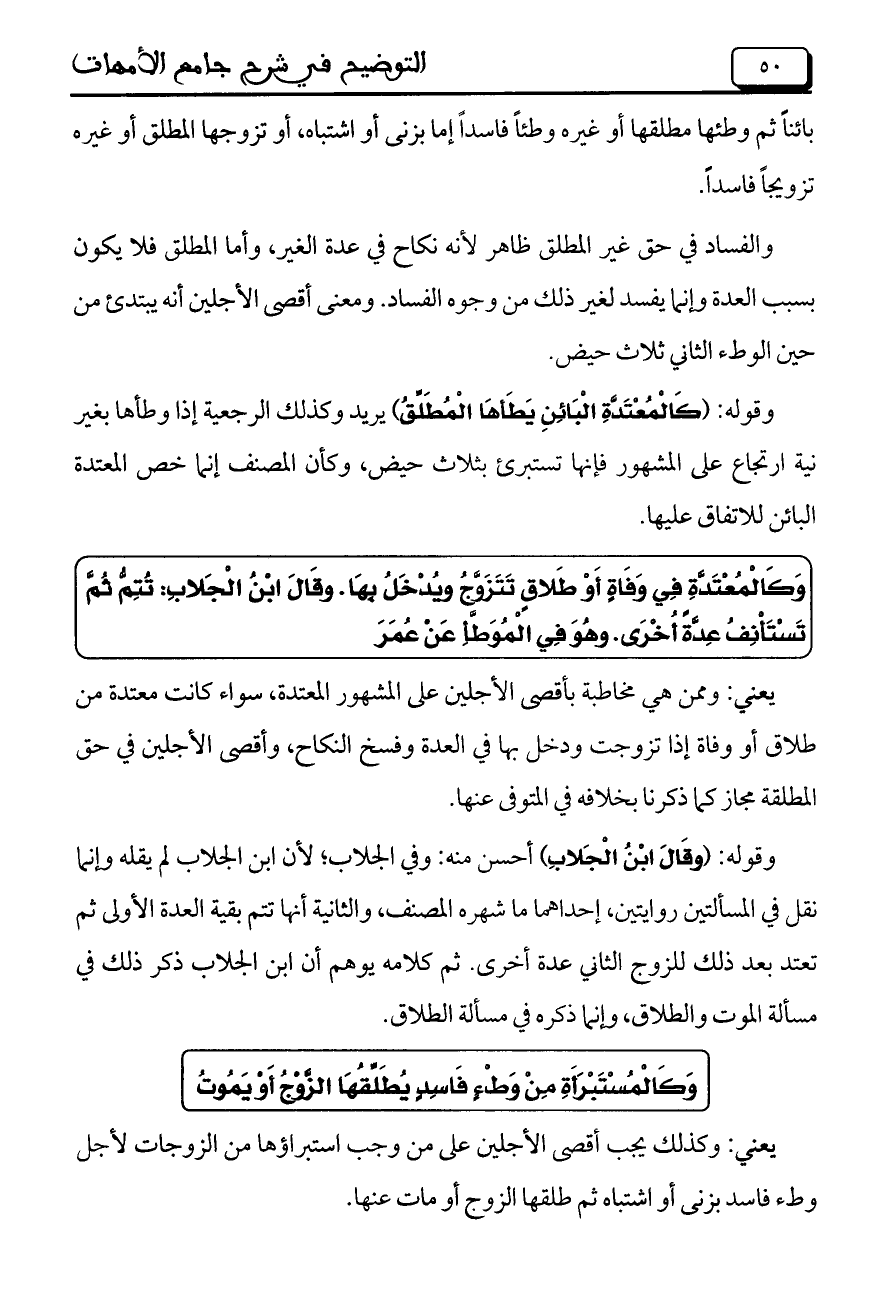 يعني: وممن هي مخاطبة بأقصى الأجلين على المشهور المعتدة، سواء كانت معتدة من طلاق أو وفاة إذا تزوجت ودخل بها في العدة وفسخ النكاح، وأقصى الأجلين في حق المطلقة مجاز كما ذكرنا بخلافه في المتوفي عنها.