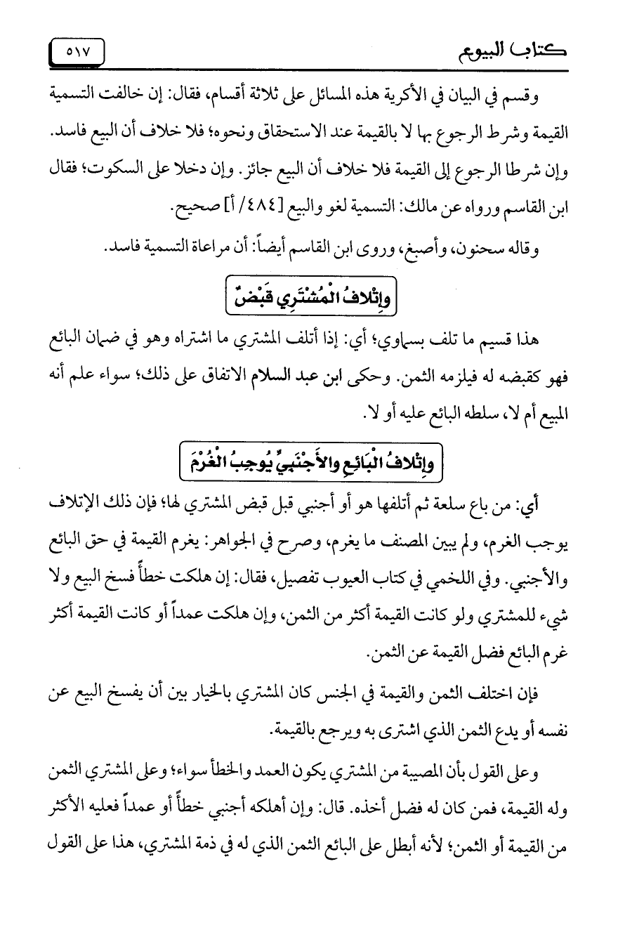 وعلى القول بأن المصيبة من المشتري يكون العمد والخطأ سواء، وعلى المشتري الثمن وله القيمة، فمن كان له فضل أخذه. قال: وإن أهلكه أجنبي خطأً أو عمداً فعليه الأكثر من القيمة أو الثمن، لأنه أبطل على البائع الثمن الذي له في ذمة المشتري، هذا على القول