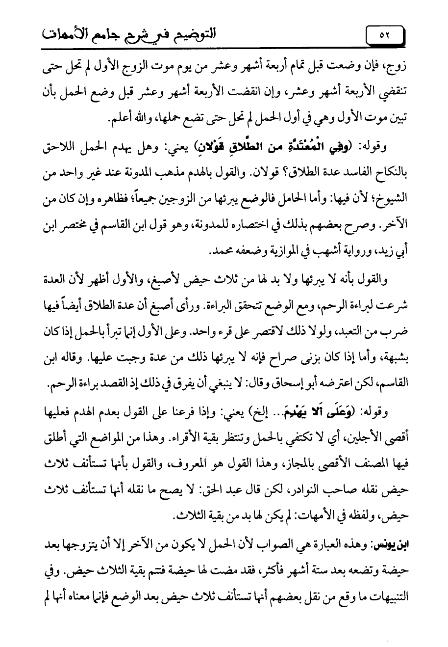 ابن يونس: وهذه العبارة هي الصواب لأن الحمل لا يكون من الآخر إلا أن يتزوجها بعد حيضة وتضعه بعد ستة أشهر فأكثر، فقد مضت لها حيضة فتتم بقية الثلاث حيض. وفي التنبيهات ما وقع من نقل بعضهم أنها تستأنف ثلاث حيض بعد الوضع فإنما معناه أنها لم