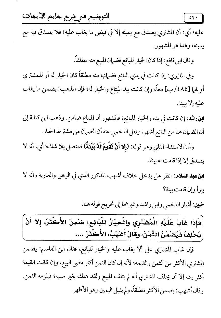 ابن راشد: إن كانت في يده والخيار للبائع، فالمشهور أن المبتاع ضامن. وذهب ابن كنانة إلى أن الضمان هنا من البائع أشهر. ونقل اللخمي عنه أن الضمان من مشترط الخيار.